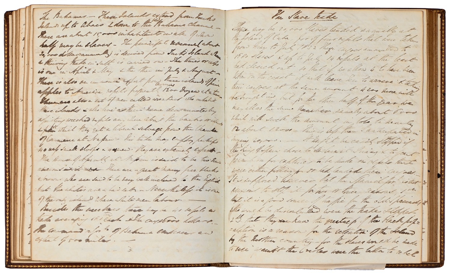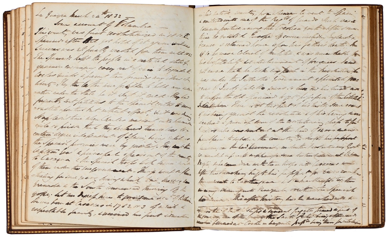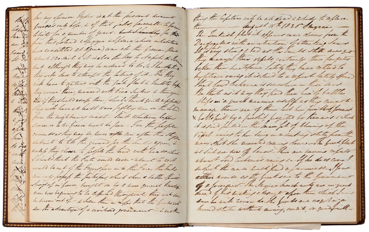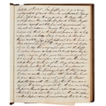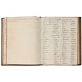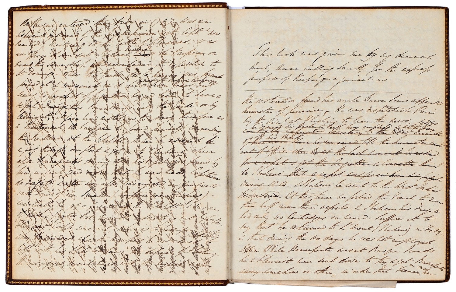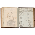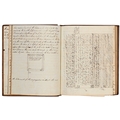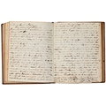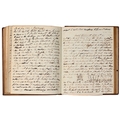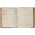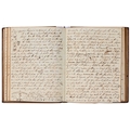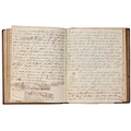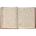 Captain the Honourable William Wellesley, Royal Navy (1806-1875), the Duke of Wellington's nephew, later of Charlton House, Radstock, Somerset, his journal, dated 16th August, 1824 to 16th January, 1833, covering his naval service during the Greek War of Independence (1821-29) against the Ottoman Empire, service in South America, the Caribbean and an account of the slave trade, the book given to him by his aunt, Lady Anne Culling Smith (née Wellesley, previously FitzRoy; 1768-1844), on-&-off entries dated August 16th 1824 - ?January 16th 1833, inscribed recto and verso, [92]; [34]ff, the remaining quarter of the textblock blank, both portions of manuscript prefixed: To be burnt in case of my death, the front also prefixed with a crossed precis of his naval career, - presumably crossed as the memoir was an afterthought to the ensuing narrative - including reference to the Bombardment of Algiers (1816), the West Indies, and Bonaparte's exile all prefacing his joining HMS Medina (1813) at Portsmouth, 18th June 1824, as a midshipman on the 'Medina' going to the Mediterranean - his appointment by Admiral Sir George Cockburn at the Duke of Wellington's request (see Wellington's Despatches Correspondence, et al (1867), volume II, page 221, no. 360), Spain, Portugal, etc., then Greece, the manuscript covering his subsequent lieutenancy (1825) on HMS Weasel (1823) and HMS Cambrian (1797), Nafplion - then in the hands of the Greeks, the Turkish fleet appearing from the Dardanelles in 1826, Constantinople (Istanbul), unfortunately this part comes to an end on 9th September, 1827, with mention of the Egyptian fleet, prior to the Battle of Navarino, 20th October, 1827, in which Wellesley is accounted as having had a trifling share; before starting again in Florence, 14th May, 1829, then Captain Wellesley, visiting the typical Grand Tour sites, before going on to other Italian localities, with observations of historic figures and local life, transcripts of vernacular verse, tables of conversion, Austrian money, commerce, then Paris from 26th August, 1829, and elsewhere in France, his account of Toulon, the major port of the French Mediterranean fleet, is prefixed by a 2pp 'spy's' list of the French ships on the Mediterranean, July 1828, that could have been an act of espionage, further tables of data about further French ships and their deployment in international waters, a diagrams of moorings, a fortification, a lock, two cross-sections of a boat, notes on ship-building in Brest and a two-page plan, further expected topographical observations, then 12pp account of Columbia, dated La Guajira, March 24th 1832, during his captaincies of HMS Sapphire (1827) or HMS Winchester (1822), including elsewhere in South America, i.e. Puerto Cobello, Caracas, etc., in Venezuela, The Grand Cayman and just over 1pp account of the domestic slave trade, Jamaica and the West India trade, the Bahamas, population data on Jamaica, Bermuda, Barbados, Grenada, St Kitts, & Trinidad, etc; then oddly back to Bishopwearmouth, Sunderland, 30th September, 1833, mining and the movement of coal; loosely-inserted 4pp letterpress advertisement for Cary's Camera Lucida; the final leaf for this side of the MS, dated Quebec, ?January 16 1833, being 2pp statistics of Canada, its population, their religion and denominations; the back, prefaced by biblical chronology and notes, opening at October *th, 1826, with raw self-examination and criticism, 'Few people can be in a more wretched state of mind than I am at present, I always feel I shall never do any good in the Navy [...]', writing onto several pages about his dissatisfaction, life and discipline onboard ship and within the naval service as a whole, then commentary on Saint Paul's Epistle to the Romans, abstracts of the Book of Genesis, contemporary Regency diced calf, rolled in blind with a foliate border, gilt triple-fillet, front and back joints split to varying degrees, but block holding, bumped &/or rubbed edges, surface scuffs, marbled endpapers, 4to