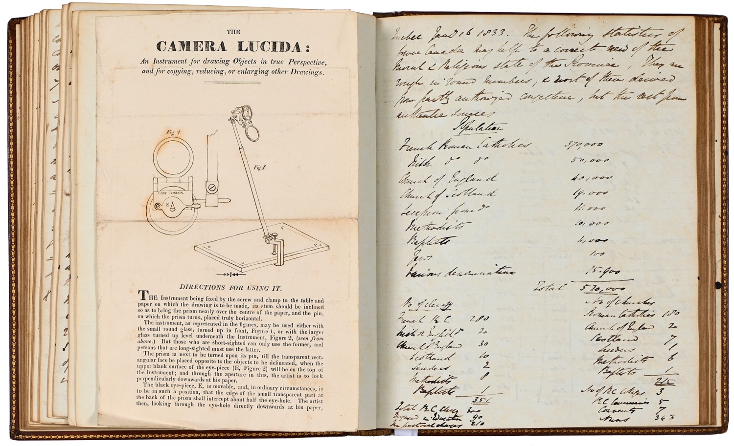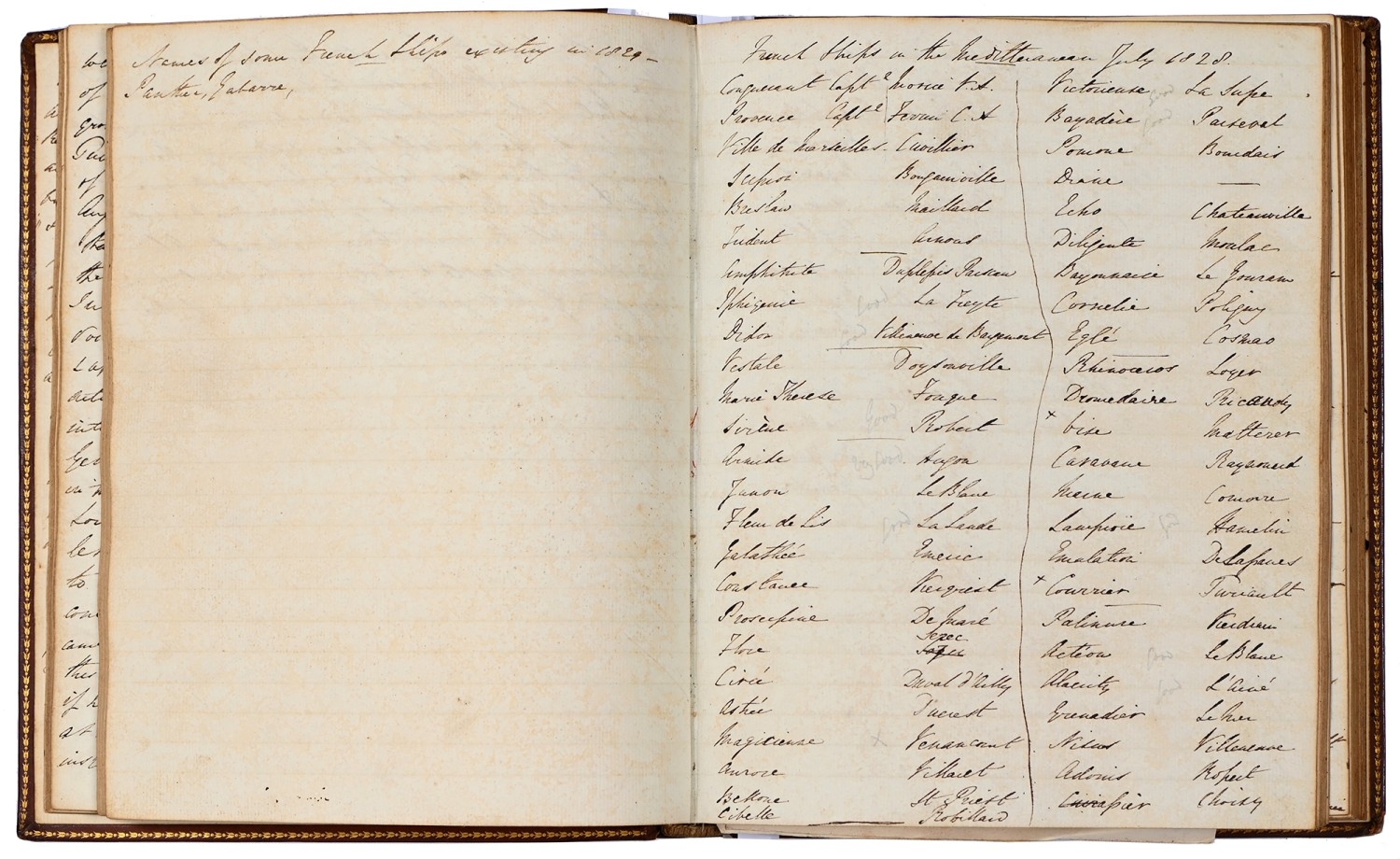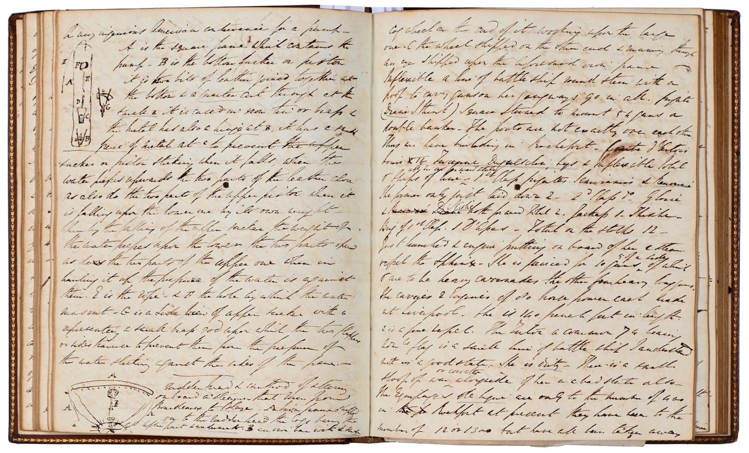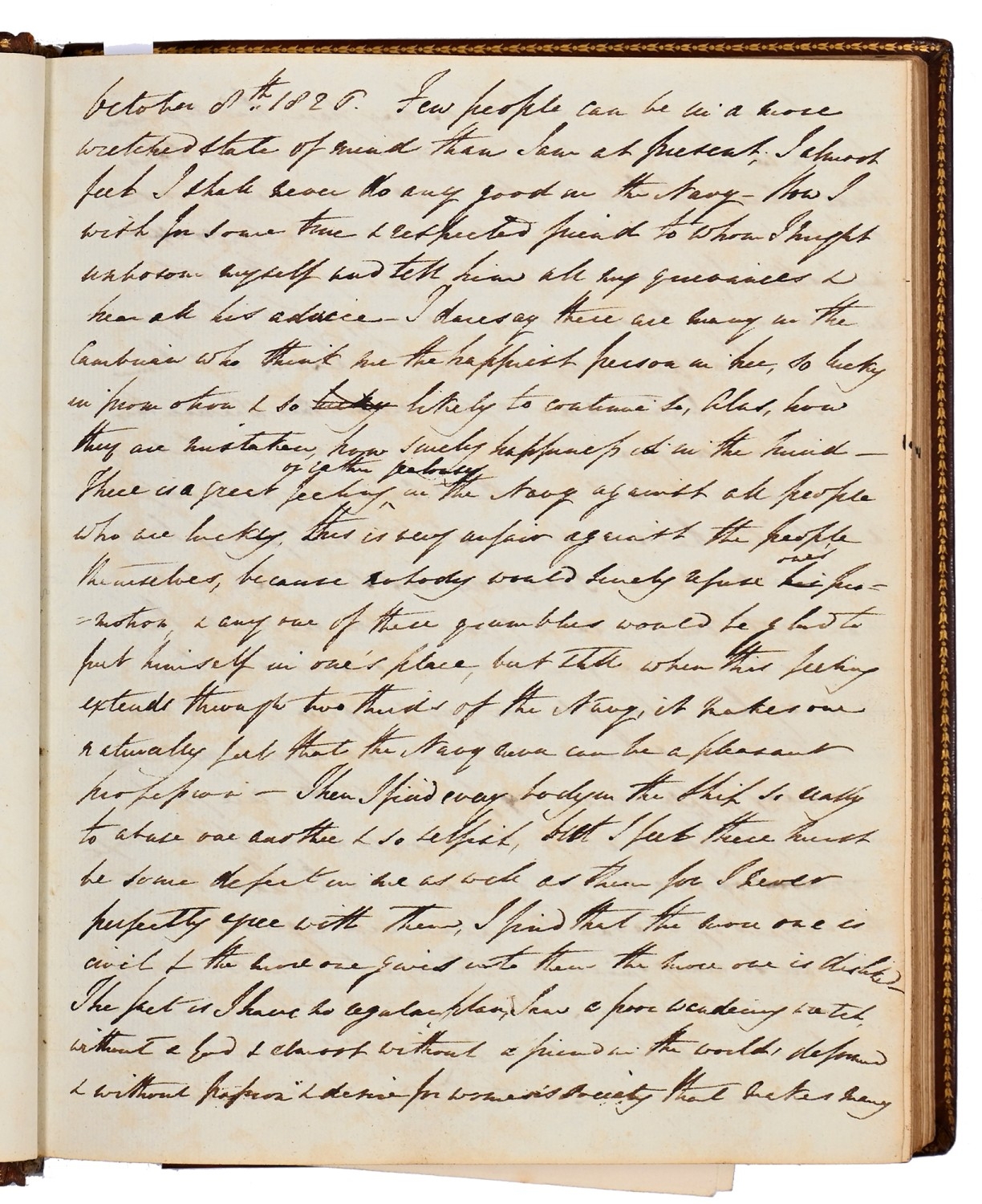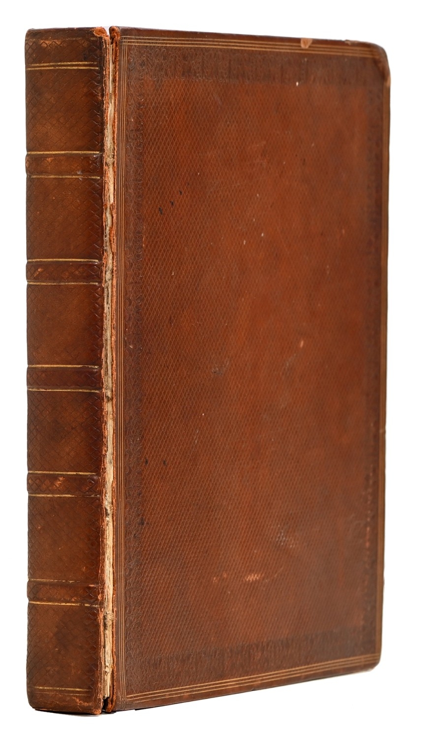 Captain the Honourable William Wellesley, Royal Navy (1806-1875), the Duke of Wellington's nephew, later of Charlton House, Radstock, Somerset, his journal, dated 16th August, 1824 to 16th January, 1833, covering his naval service during the Greek War of Independence (1821-29) against the Ottoman Empire, service in South America, the Caribbean and an account of the slave trade, the book given to him by his aunt, Lady Anne Culling Smith (née Wellesley, previously FitzRoy; 1768-1844), on-&-off entries dated August 16th 1824 - ?January 16th 1833, inscribed recto and verso, [92]; [34]ff, the remaining quarter of the textblock blank, both portions of manuscript prefixed: To be burnt in case of my death, the front also prefixed with a crossed precis of his naval career, - presumably crossed as the memoir was an afterthought to the ensuing narrative - including reference to the Bombardment of Algiers (1816), the West Indies, and Bonaparte's exile all prefacing his joining HMS Medina (1813) at Portsmouth, 18th June 1824, as a midshipman on the 'Medina' going to the Mediterranean - his appointment by Admiral Sir George Cockburn at the Duke of Wellington's request (see Wellington's Despatches Correspondence, et al (1867), volume II, page 221, no. 360), Spain, Portugal, etc., then Greece, the manuscript covering his subsequent lieutenancy (1825) on HMS Weasel (1823) and HMS Cambrian (1797), Nafplion - then in the hands of the Greeks, the Turkish fleet appearing from the Dardanelles in 1826, Constantinople (Istanbul), unfortunately this part comes to an end on 9th September, 1827, with mention of the Egyptian fleet, prior to the Battle of Navarino, 20th October, 1827, in which Wellesley is accounted as having had a trifling share; before starting again in Florence, 14th May, 1829, then Captain Wellesley, visiting the typical Grand Tour sites, before going on to other Italian localities, with observations of historic figures and local life, transcripts of vernacular verse, tables of conversion, Austrian money, commerce, then Paris from 26th August, 1829, and elsewhere in France, his account of Toulon, the major port of the French Mediterranean fleet, is prefixed by a 2pp 'spy's' list of the French ships on the Mediterranean, July 1828, that could have been an act of espionage, further tables of data about further French ships and their deployment in international waters, a diagrams of moorings, a fortification, a lock, two cross-sections of a boat, notes on ship-building in Brest and a two-page plan, further expected topographical observations, then 12pp account of Columbia, dated La Guajira, March 24th 1832, during his captaincies of HMS Sapphire (1827) or HMS Winchester (1822), including elsewhere in South America, i.e. Puerto Cobello, Caracas, etc., in Venezuela, The Grand Cayman and just over 1pp account of the domestic slave trade, Jamaica and the West India trade, the Bahamas, population data on Jamaica, Bermuda, Barbados, Grenada, St Kitts, & Trinidad, etc; then oddly back to Bishopwearmouth, Sunderland, 30th September, 1833, mining and the movement of coal; loosely-inserted 4pp letterpress advertisement for Cary's Camera Lucida; the final leaf for this side of the MS, dated Quebec, ?January 16 1833, being 2pp statistics of Canada, its population, their religion and denominations; the back, prefaced by biblical chronology and notes, opening at October *th, 1826, with raw self-examination and criticism, 'Few people can be in a more wretched state of mind than I am at present, I always feel I shall never do any good in the Navy [...]', writing onto several pages about his dissatisfaction, life and discipline onboard ship and within the naval service as a whole, then commentary on Saint Paul's Epistle to the Romans, abstracts of the Book of Genesis, contemporary Regency diced calf, rolled in blind with a foliate border, gilt triple-fillet, front and back joints split to varying degrees, but block holding, bumped &/or rubbed edges, surface scuffs, marbled endpapers, 4to