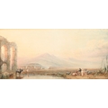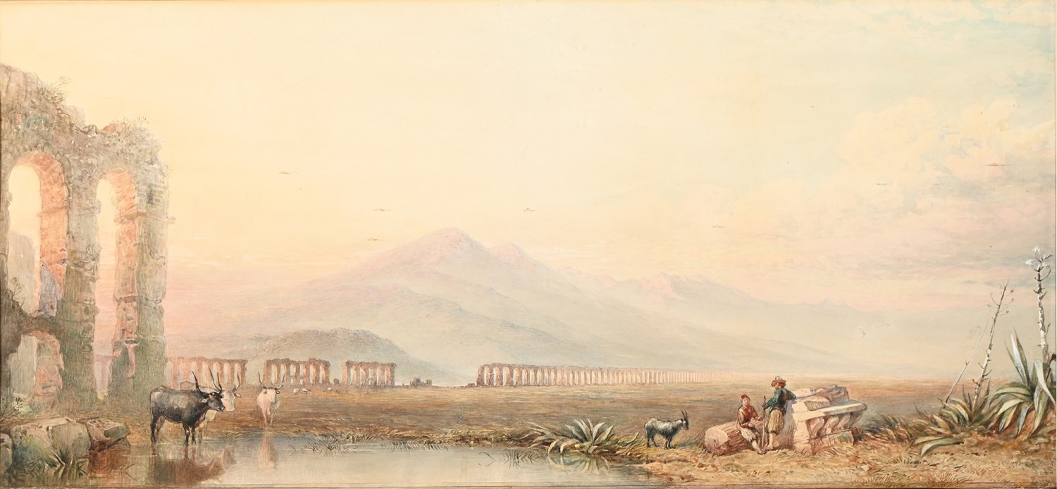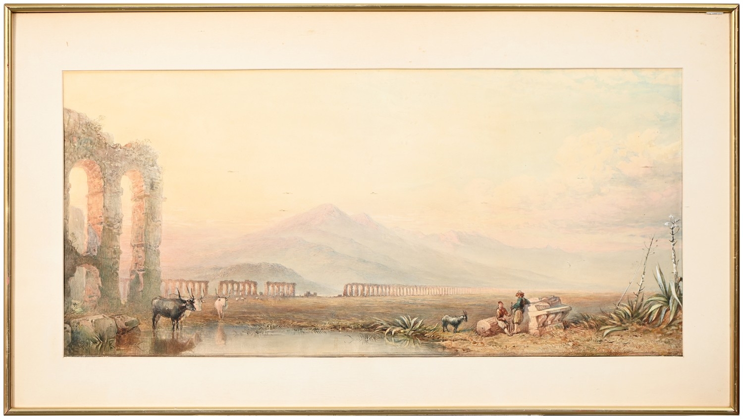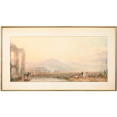 William Collingwood Smith RWS (1815-1887) - The Claudian Aqueduct in the Roman Campagna, signed and dated 1885, inscribed on an old label on the backboard, possibly in the artist's hand, and several other early labels, one referring to "The late W Collingwood Smith RWS", watercolour, 44.5 x 96cm