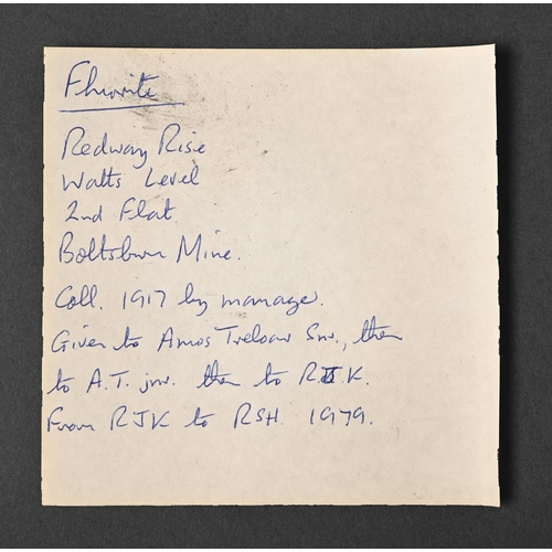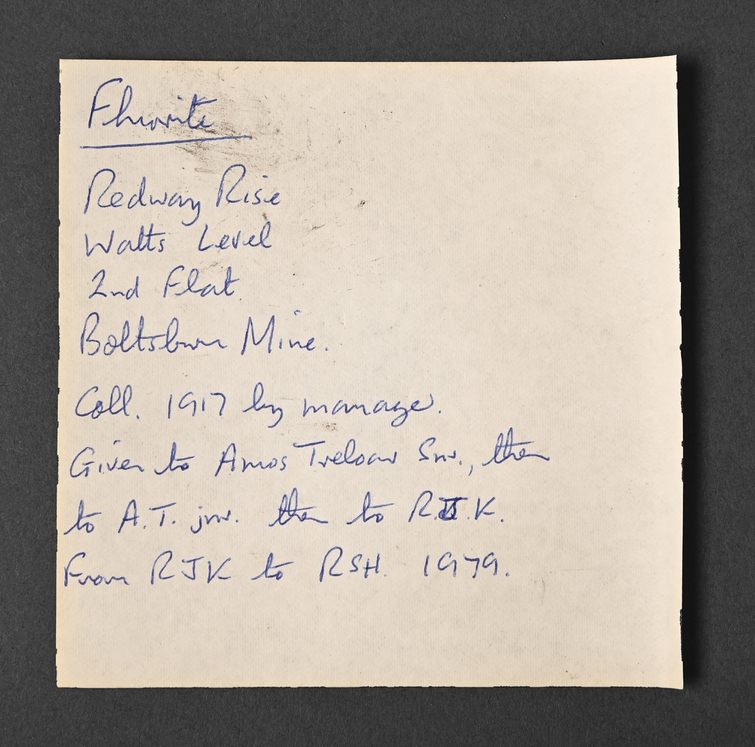 Fluorite, Redway Rise, Watt's Level, Second Flat, Boltsburn Mine, Weardale, 140mm, Harker Collection label