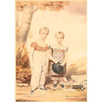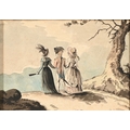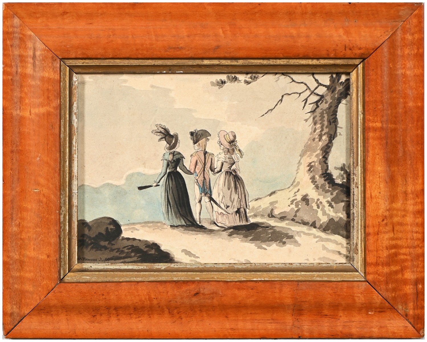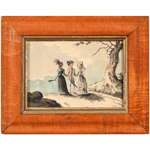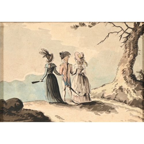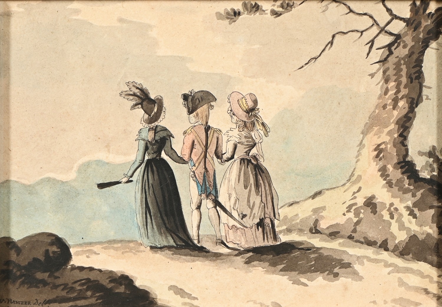 W Hamper, 18th century - An Officer arm-in-arm with Two Young Women, signed (W HAMPER Del) and dated 1783, watercolour (on paper watermarked J WHATMAN), 13 x 17cm