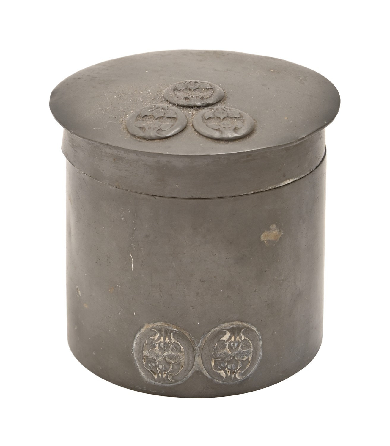 Liberty & Co. A Tudric pewter tea caddy and cover, the design attributed to Archibald Knox, c1900, 9cm h, stamped TUDRIC 0 1 0 6, 9cm h