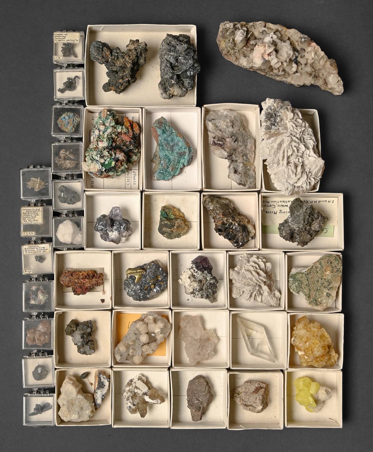 Cornish minerals. Botallackite, Levant Mines, 60mm, Chalcophyllite, Wheal Gorland, St Day, 33mm, Olivenite, Wheal Gorland, St Day, 66mm and appox thirty-nine others, including several from other locations, all with Harker Collection labels and those of other collections, including Richard Barstow and Brian S Lloyd (39)
