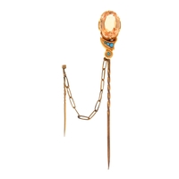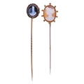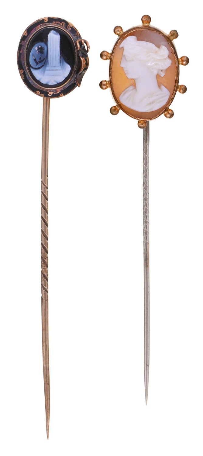 Two Victorian gold stickpins, with cameo terminal, one a mourning example with hardstone cameo of broken pillar and flower, the pins of gold, heads 15 and 21mm, 6.2g