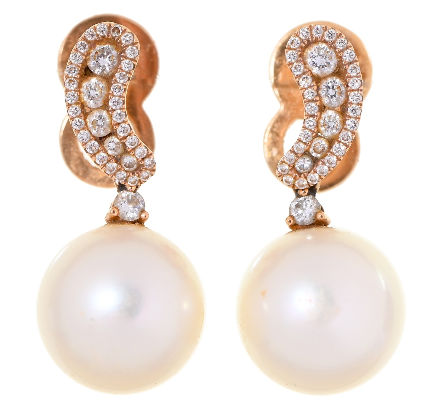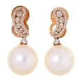 A pair of diamond and cultured pearl earrings, in 18ct gold, 26mm h, Convention marked, 8.4g
