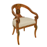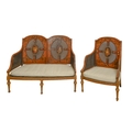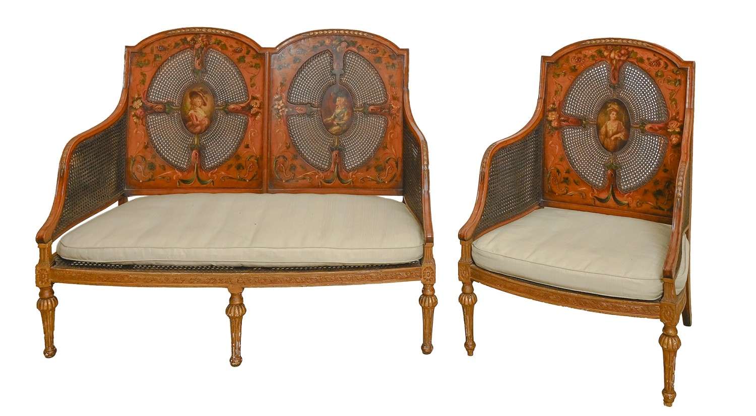 A Victorian painted satinwood twin chair-back settee and bergère, c1900, the breakarched frame and arms carved with husk pendants, the caned back centred by an oval medallion painted with portraits of ‘Gainsborough’ ladies in borders of grapevines, fruit and flowers, on fluted gilt legs with mushroom knop, settee 119cm long