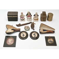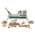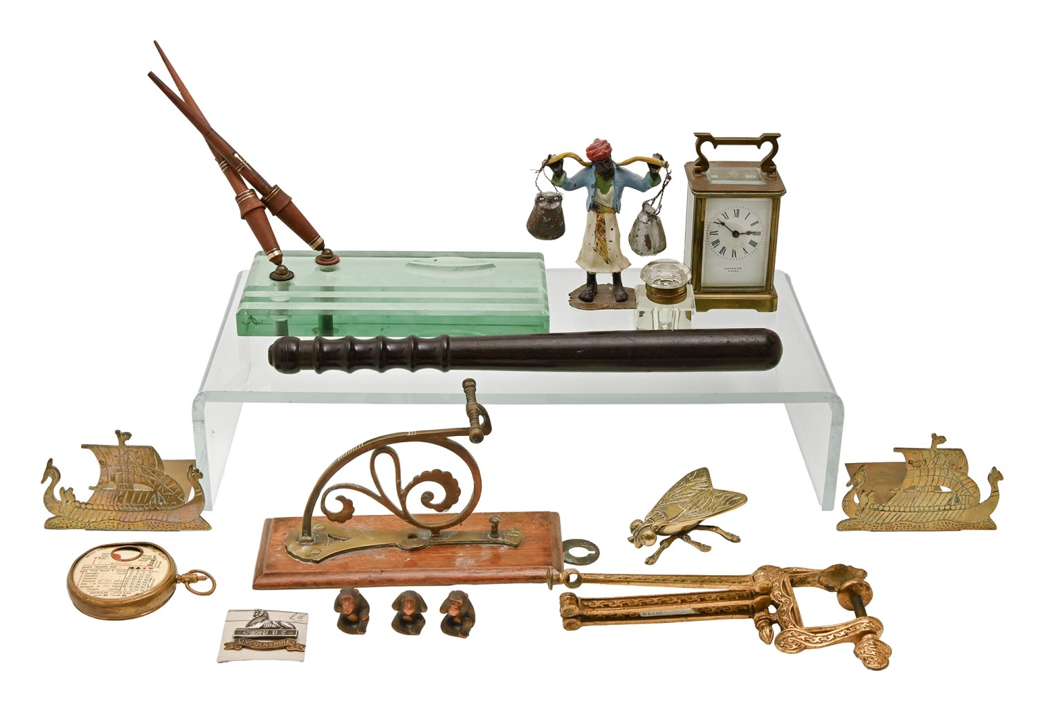 Miscellaneous bygones, early 20th c and later, including brass carriage timepiece, with platform lever escapement, the dial inscribed Usher & Son Lincoln, 11cm h excluding handle, brass mounted glass inkwell, turned wood truncheon, 40cm l, set of three Japanese carved boxwood monkeys, 33mm h and smaller, brass, etc