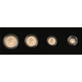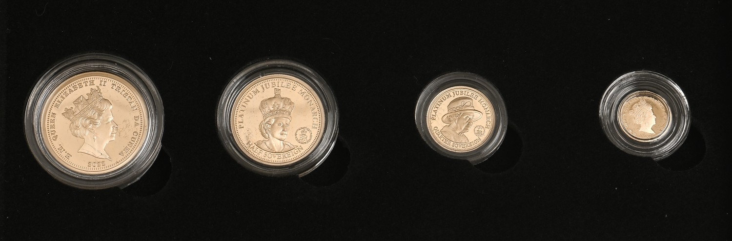 Gold coins. Tristan da Cunha, proof commemorative bi-metal gold and platinum Sovereign four coin set 2022, (22ct + 2ct platinum) Sovereign, Half sovereign, Quarter sovereign and One Eighth Sovereign, cased