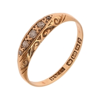 Worn, the white stones (?) heavily scratched, the size of the ring altered by gold insertion
