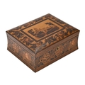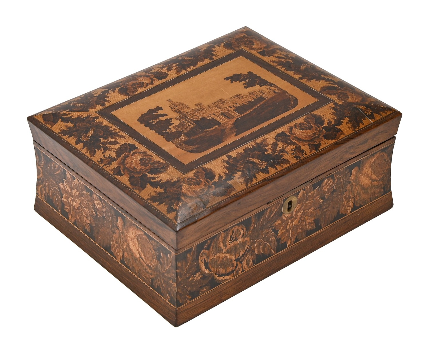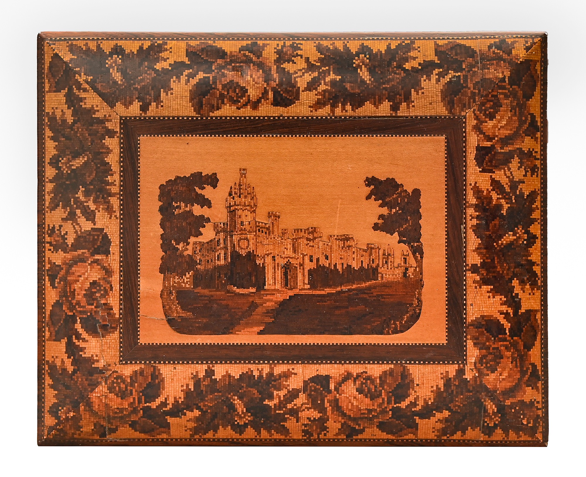 A Victorian Tunbridge ware sewing box, of rosewood, the lid with a mosaic of Eridge Castle, further decorated with roses, 11cm h; 21.5 x 27cm