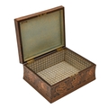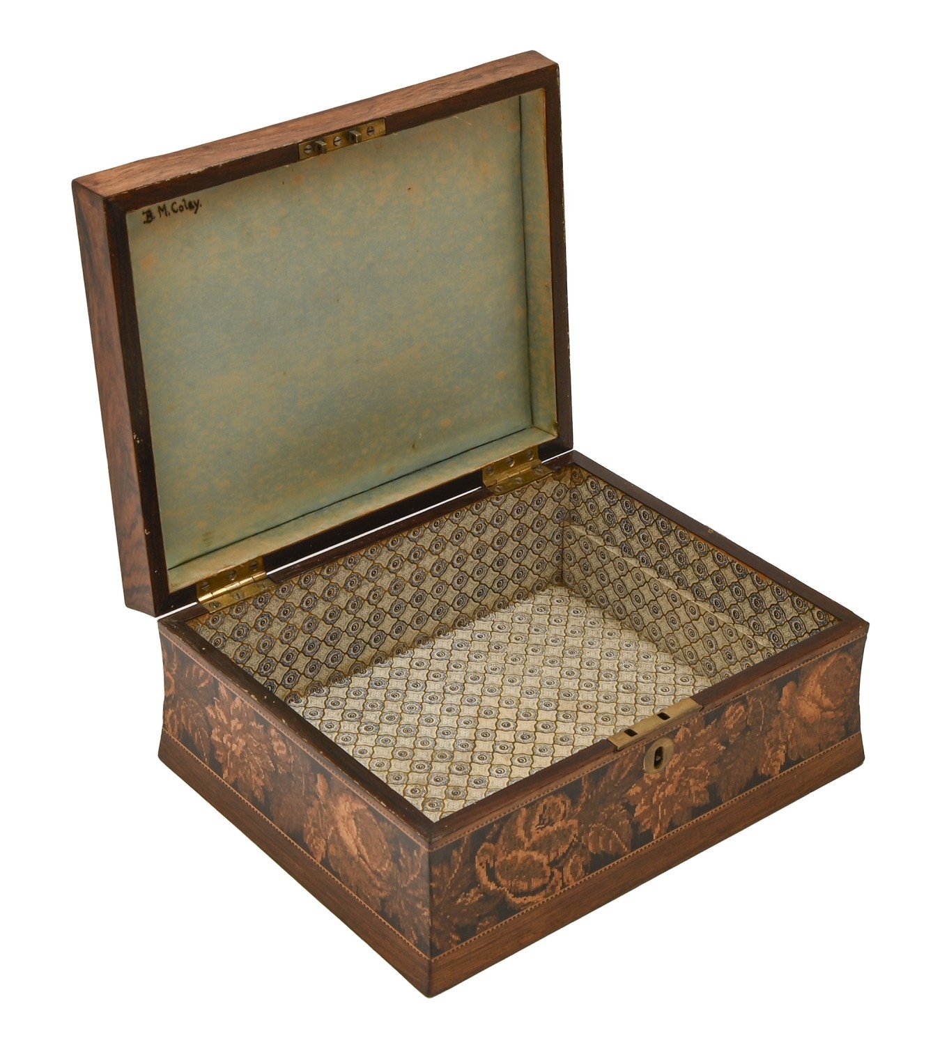 Loss of fitted interior, two small splits along rose border of lid but in otherwise good condition with only minor wear