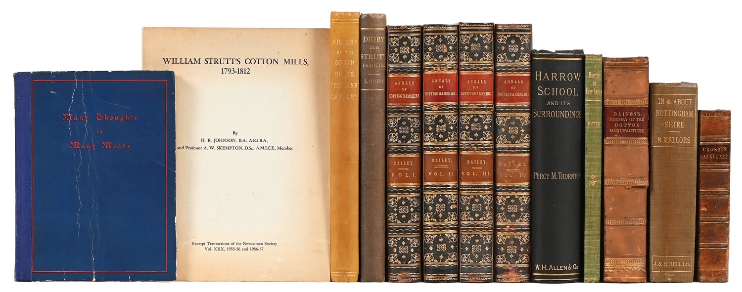 Digby (Lettice), My Ancestors: Being the History of the Digby & Strutt Families, sole edition, London: Privately Printed by Spottiswoode, Ballantyne & Co. Ltd., 1928, half-title, folding pedigrees, original publisher's cloth, gilt armorial, top edge gilt, others uncut, 8vo; Bailey (Thomas), Annals of Nottinghamshire, four volume set, first edition, London: Simpkin, Marshall, and Co., n.d. [1852-55], black-ruled, folding map, plates and in-text illustrations, contemporary blue diced calf gilt, morocco lettering pieces, all edges gilt, 4to; Crosby's Complete Pocket Gazetteer of England and Wales, or Traveller's Companion, London: Baldwin, Craddock & Joy, 1815, double-column, two folding hand-coloured maps, contemporary olive calf gilt, marbled edges and endpapers, contemporary crested bookplate: William Strutt, 12mo in 6s; Fellows (George, Captain and Hon. Major), History of the South Notts. Yeomanry Cavalry, 1794 to 1894, Nottingham: Thomas Forman & Sons, 1895, illustrated, original two tone-cloth gilt, top edge gilt, others uncut, 4to; Baines (Edward, Junior), History of the Cotton Manufacture in Great Britain, first edition, London: H. Fisher et al, n.d. [1835], plates, contemporary calf gilt, upper joint split, 8vo; Thornton's Harrow School, 1885, original cloth, 8vo; etc., (13)