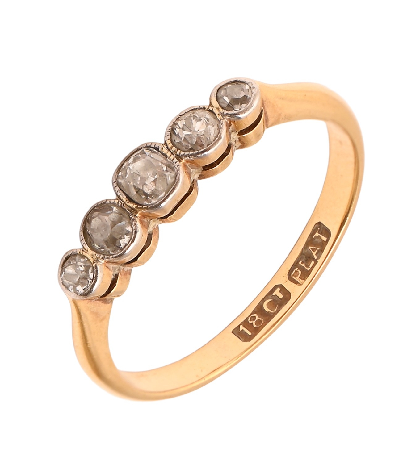 A diamond ring, with round and cushion shaped old cut diamonds, millegrain set, gold hoop marked 18ct PLAT, 2.3g, size L