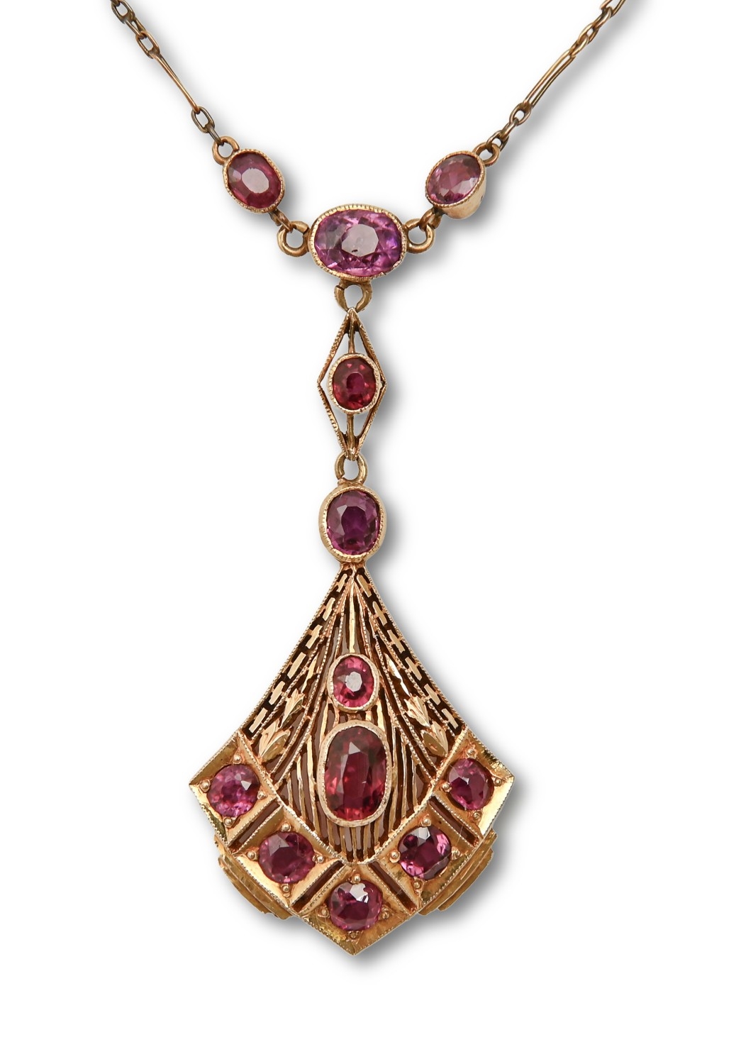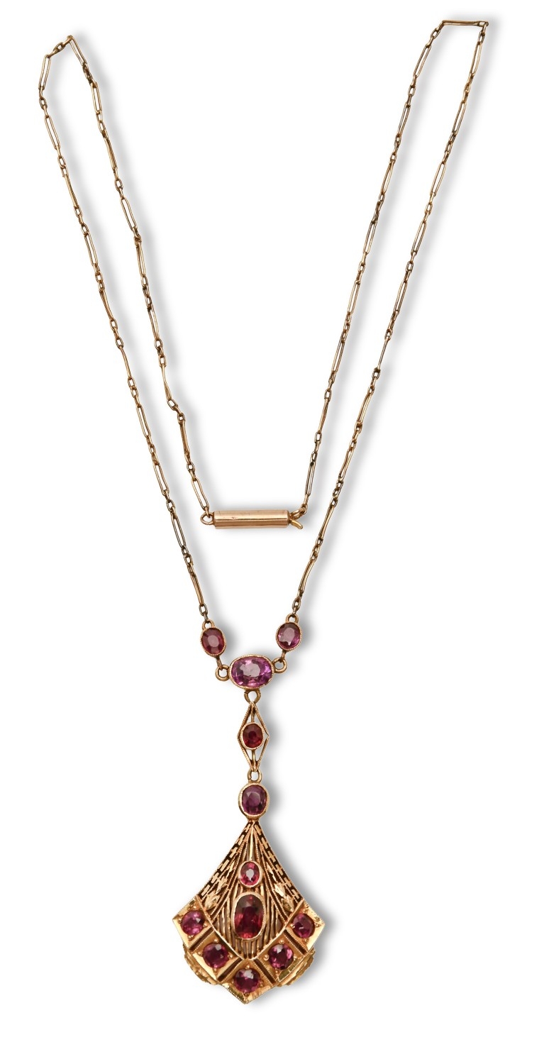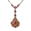 A ruby necklet, in gold, fully articulated, 53mm h, marked 18K, sold with the original receipt of R.M.A. Raheem, Jeweller, Colombo, Ceylon [Sri Lanka], 16th January 1939 "...to make one 18ct gold pendant and chain set with Burmese rubies 70 Rs", 7g