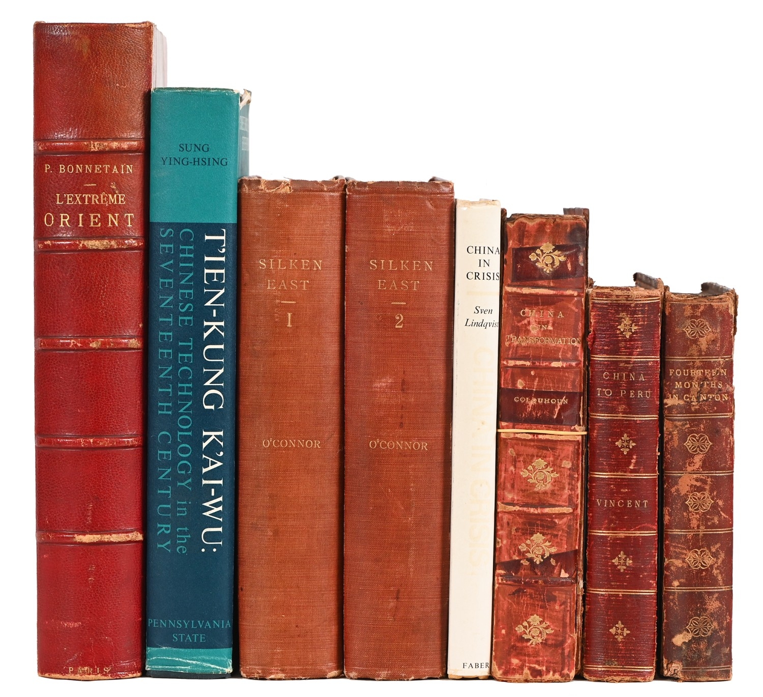 China. Gray (Mrs. [John Henry]), Fourteen Months in Canton, first edition, London: Macmillan and Co., 1880, in-text illustrations, contemporary quarter-roan gilt over marbled boards, worn, 8vo; Vincent (Mrs. Howard) & (Col. Howard), China to Peru, first edition, London: Sampson Low, Marston & Company, 1894, half-title, folding map and plates, contemporary quarter-roan, split, 8vo; Colquhoun (Archibald R.), China in Transformation, first edition, London and New York: Harper & Brothers, 1898, half-title, frontispiece, folding maps/plans, disbound red half-calf, Baron Burton's Rangemore bookplate, 8vo; Ying-Hsing (Sung), Chinese Technology in the Seventeenth Century, first English edition, The Pennsylvania State University Press, 1966, ex-library stamps and bookplate, original dustjacket over cloth boards, large 8vo; etc; with O'Connor (V.C., Comptroller of Assam), The Silken East: A Record of Life and Travel in Burma, two volume set, first edition, London: Hutchinson & Co., 1904, colour plates and b/w illustrations, contemporary red cloth gilt, 8vo; Bonnetain (Paul), L'Extrême-Orient, Paris: Maison Quantin, 1887, in-text illustrations, contemporary half-morocco over marbled boards, enclosing original pictorial wrappers, top edge gilt, others uncut, 4to, (8)