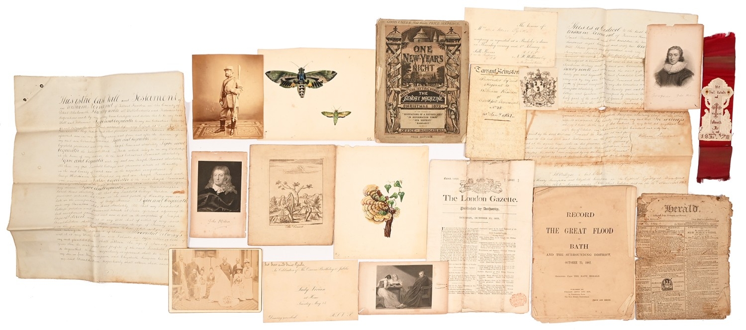 Preaching in Georgian England. Anon, three manuscript sermons, dated where and when preached, including at Warborough, Oxfordshire, 1781-1838, [39]pp, wrappers, 4to; The Sunday Magazine, Christmas 1872, including A Ghost Story, original wrappers, 8vo; an early 19th c watercolour study of winged insects, monogrammed *.C. and dated 1828, 18 x 22.5cm, another of fungus; provincial newspaper: 1795 copy of the Leicester Herald; Victorian portrait photograph, William Lascelles, 6th Company of the Inns of Court Volunteers, June 23 1860, in his military uniform; William Riman, blacksmith of Dorset, his 19th c muniments; further ephemera, both manuscript and printed, invitation cards, etc