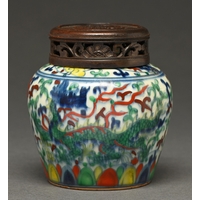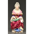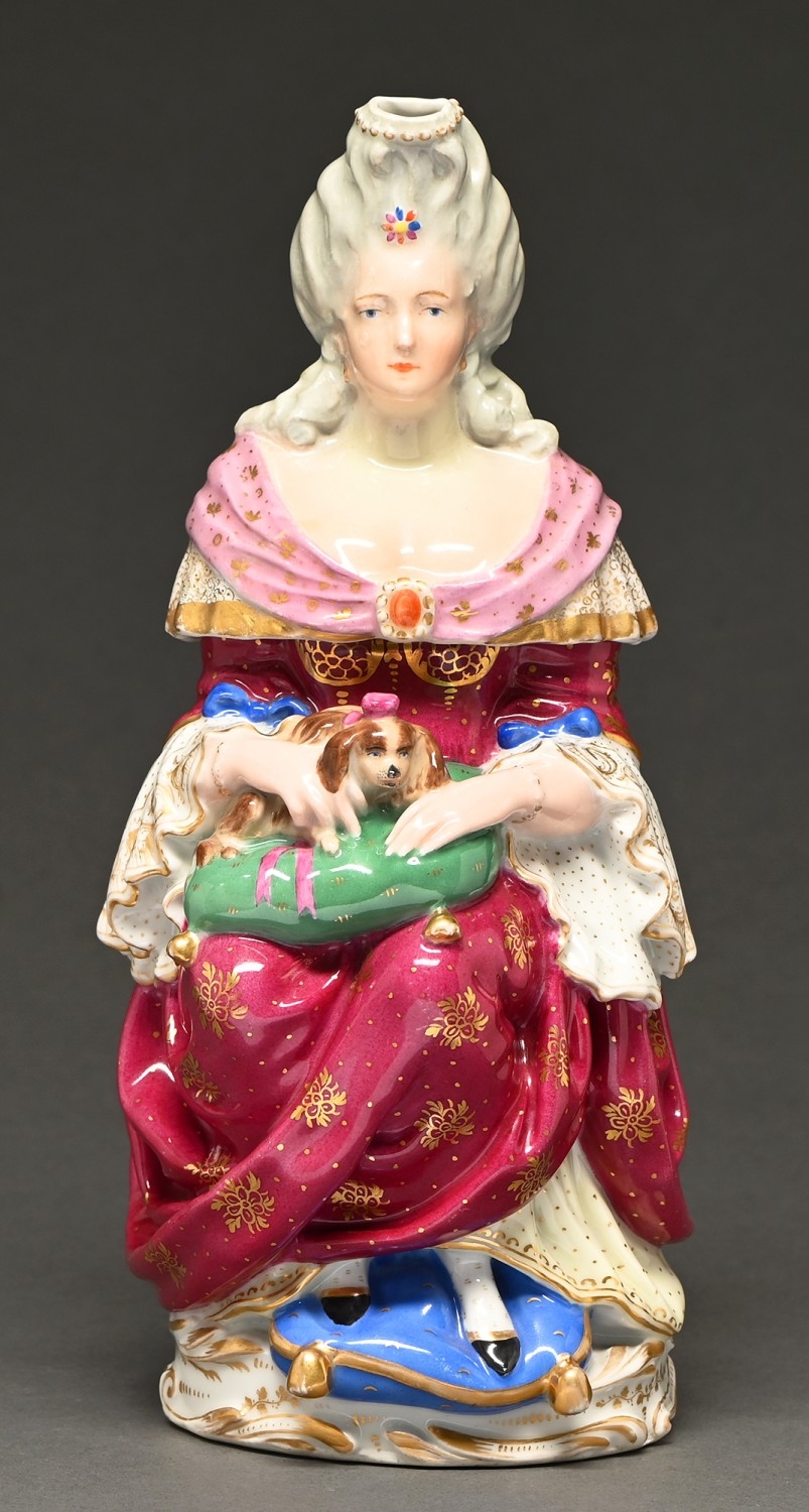A French porcelain figural veilleuse, probably Jacob Petit, mid 19th c, in two parts as the figure of a lady in a claret and gilt dress with a lapdog on a green cushion, 33cm h