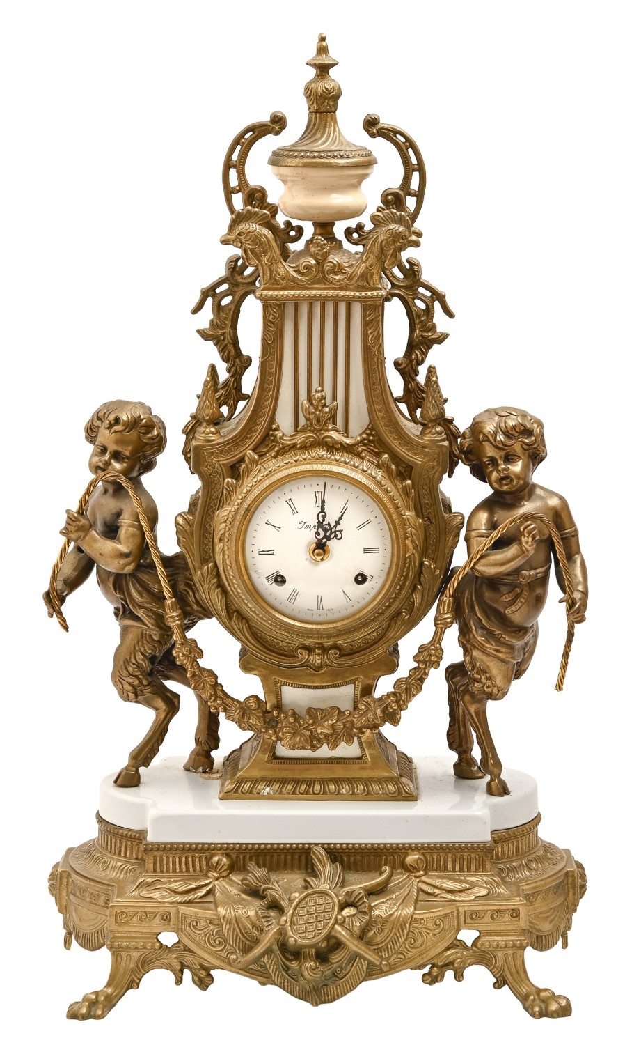 A brass and marble mantle clock, late 20th c, Louis XIV style, mounted with a pair of fauns, dial inscribed Imperial, 61 x 35cm