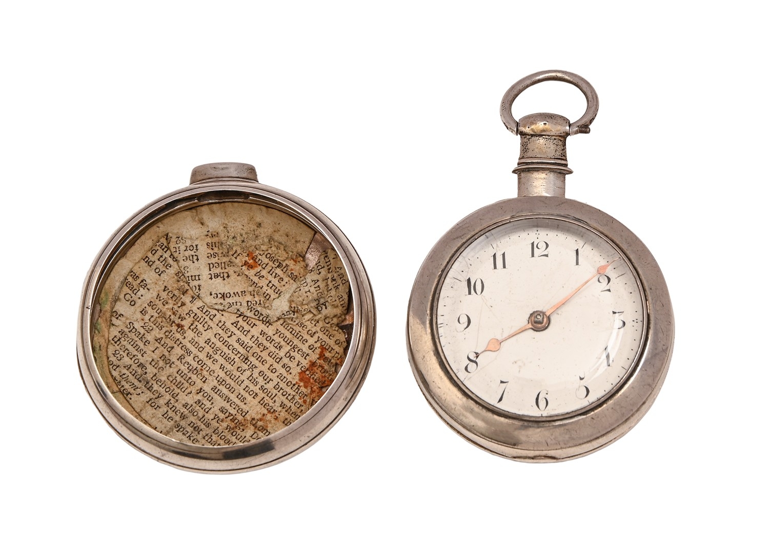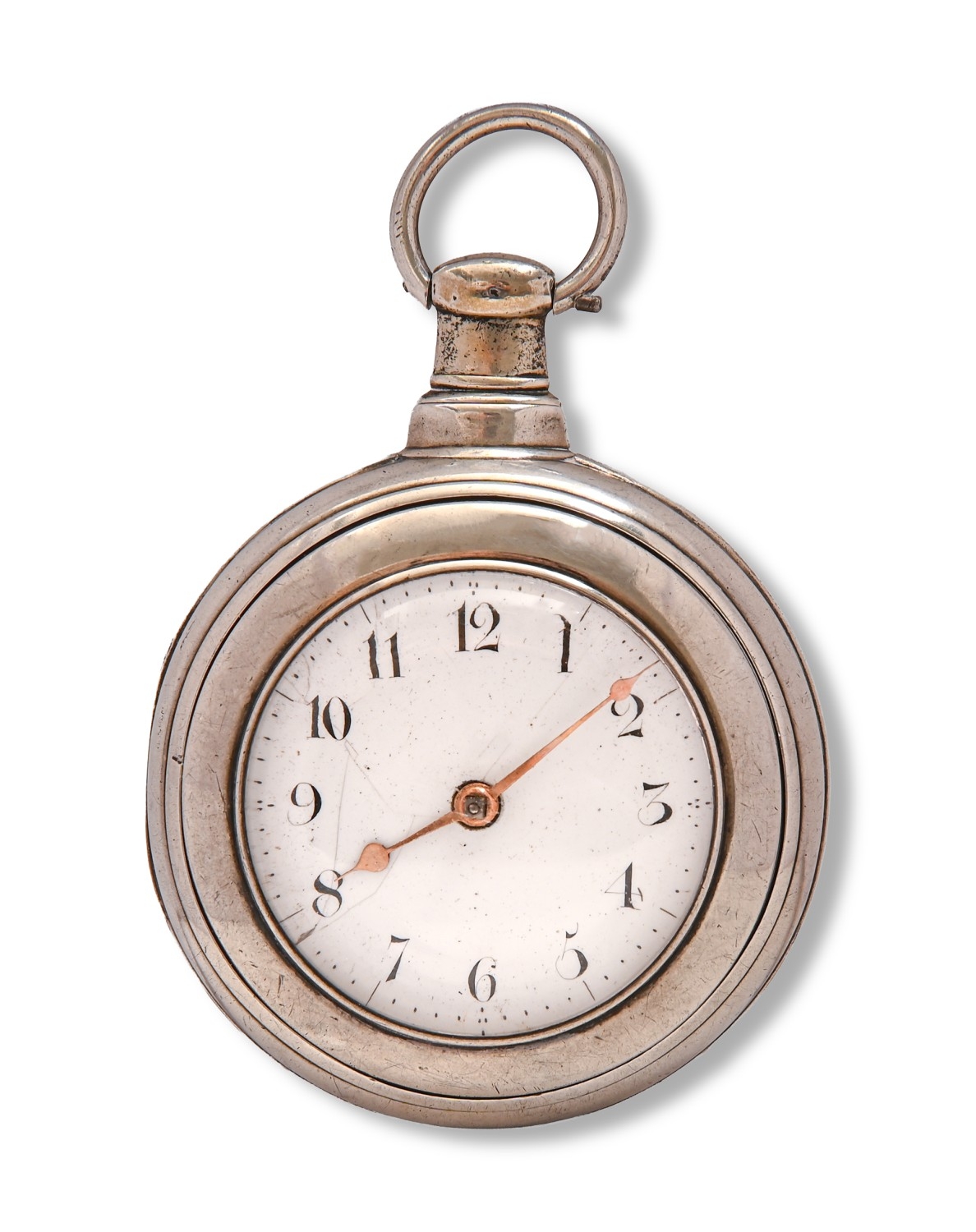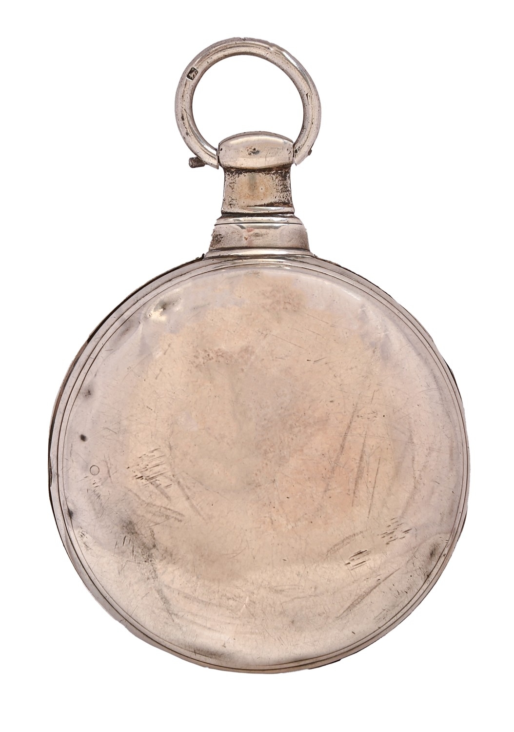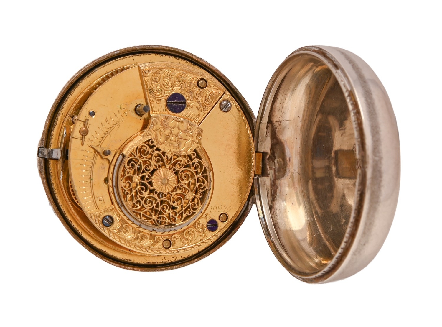 An English silver pair-cased verge watch, unsigned, No 19270, with finely pierced and engraved watch cock and foot, 5.5cm diam, Birmingham 1813