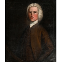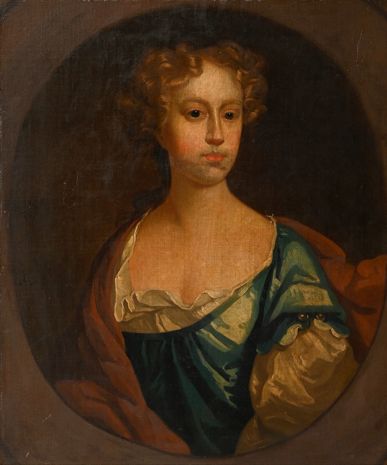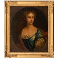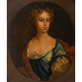 Follower of Sir Godfrey Kneller - Portrait of a Lady, bust length in a blue dress with pearls, feigned oval, oil on canvas laid on panel, 75 x 63cm