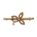 An amethyst and split pearl bar brooch, in gold, 45mm l, marked 15ct, 3.7g