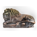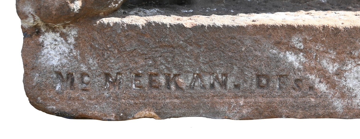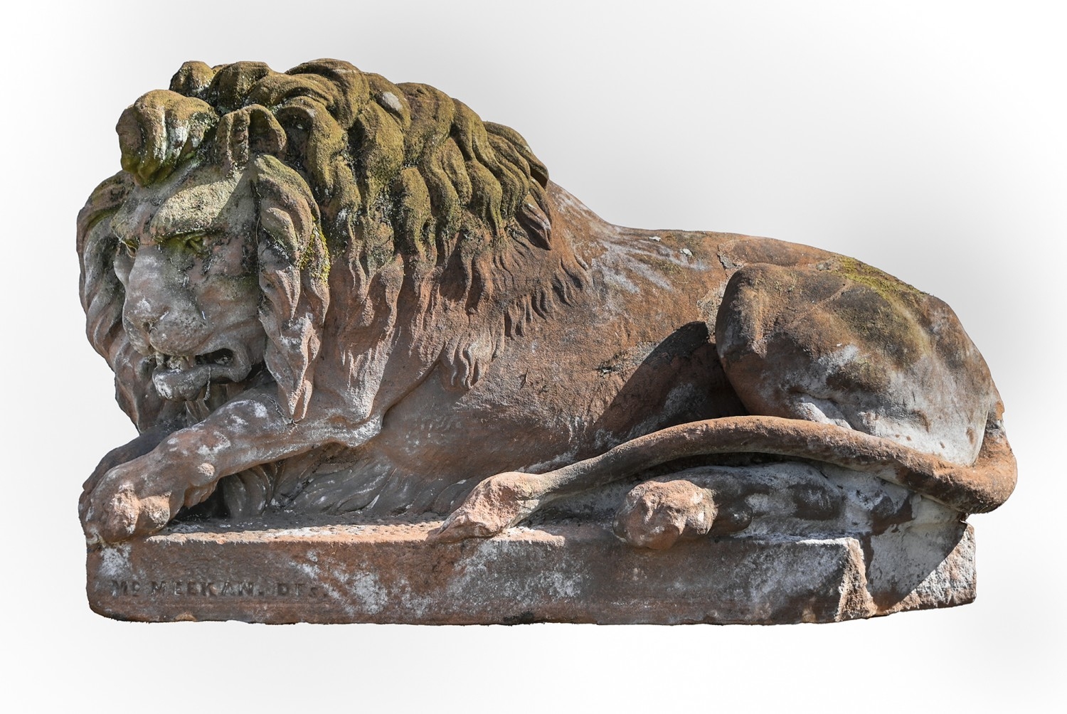 A Victorian over life-sized sandstone sculpture of a lion, on rectangular base, 83cm h, 141cm l, signed McMEEKAN DES