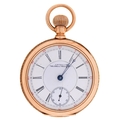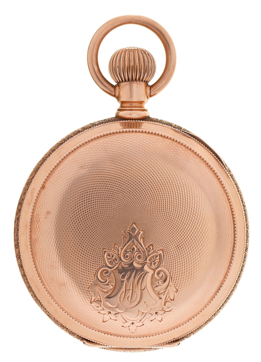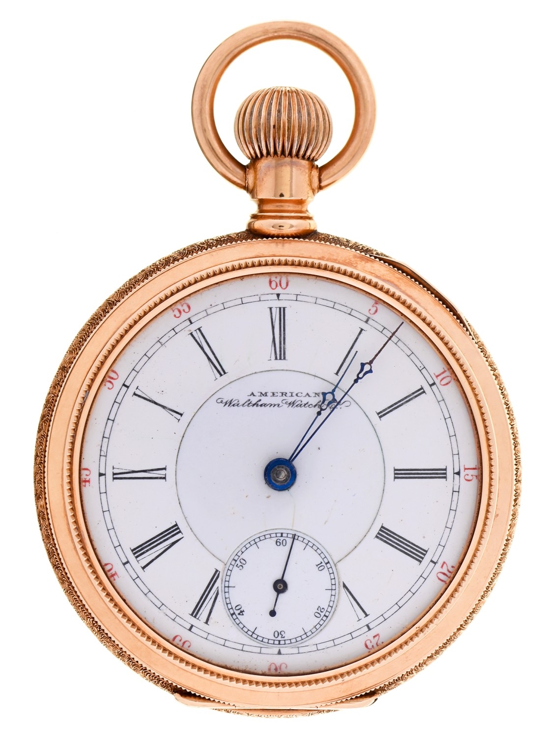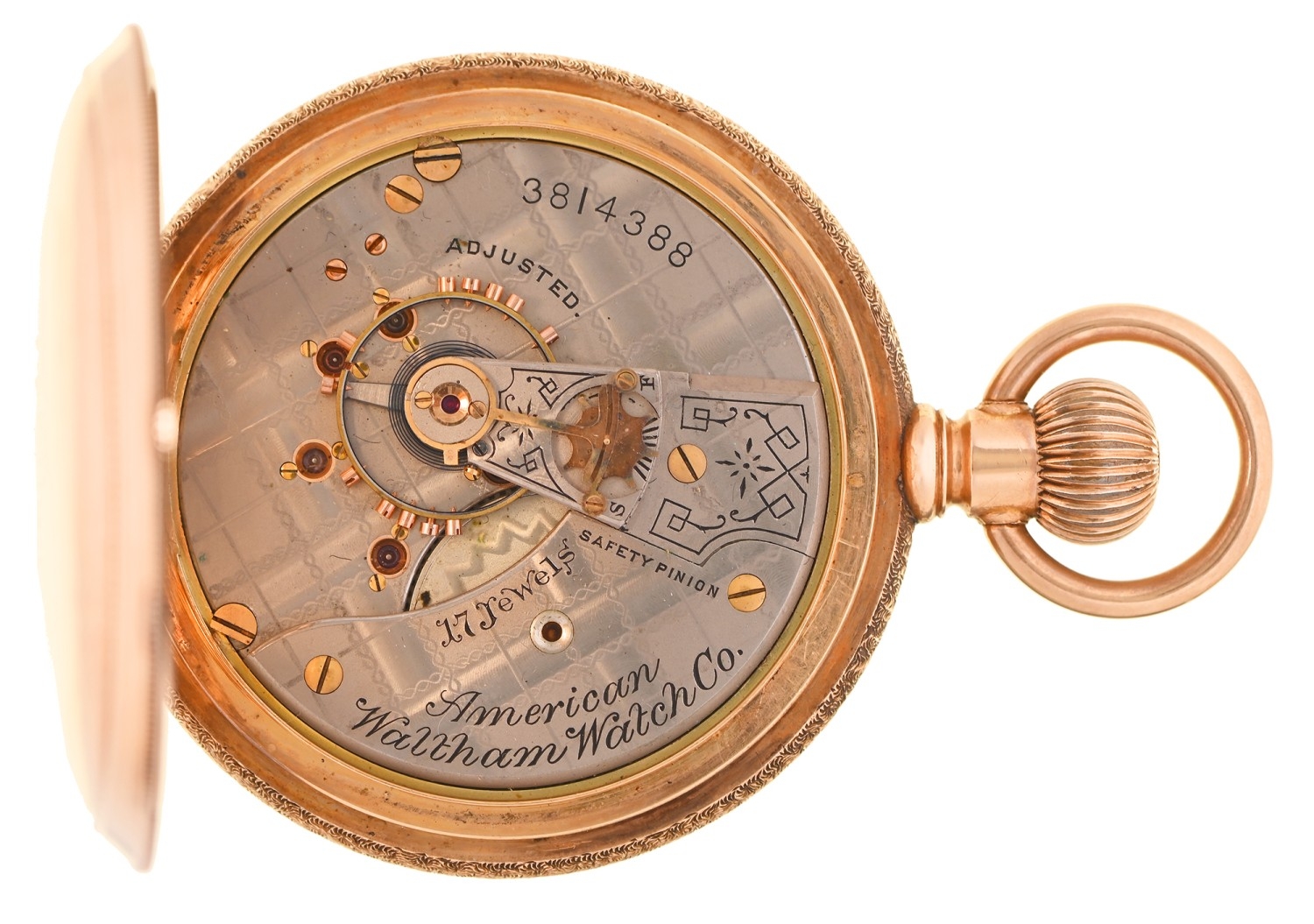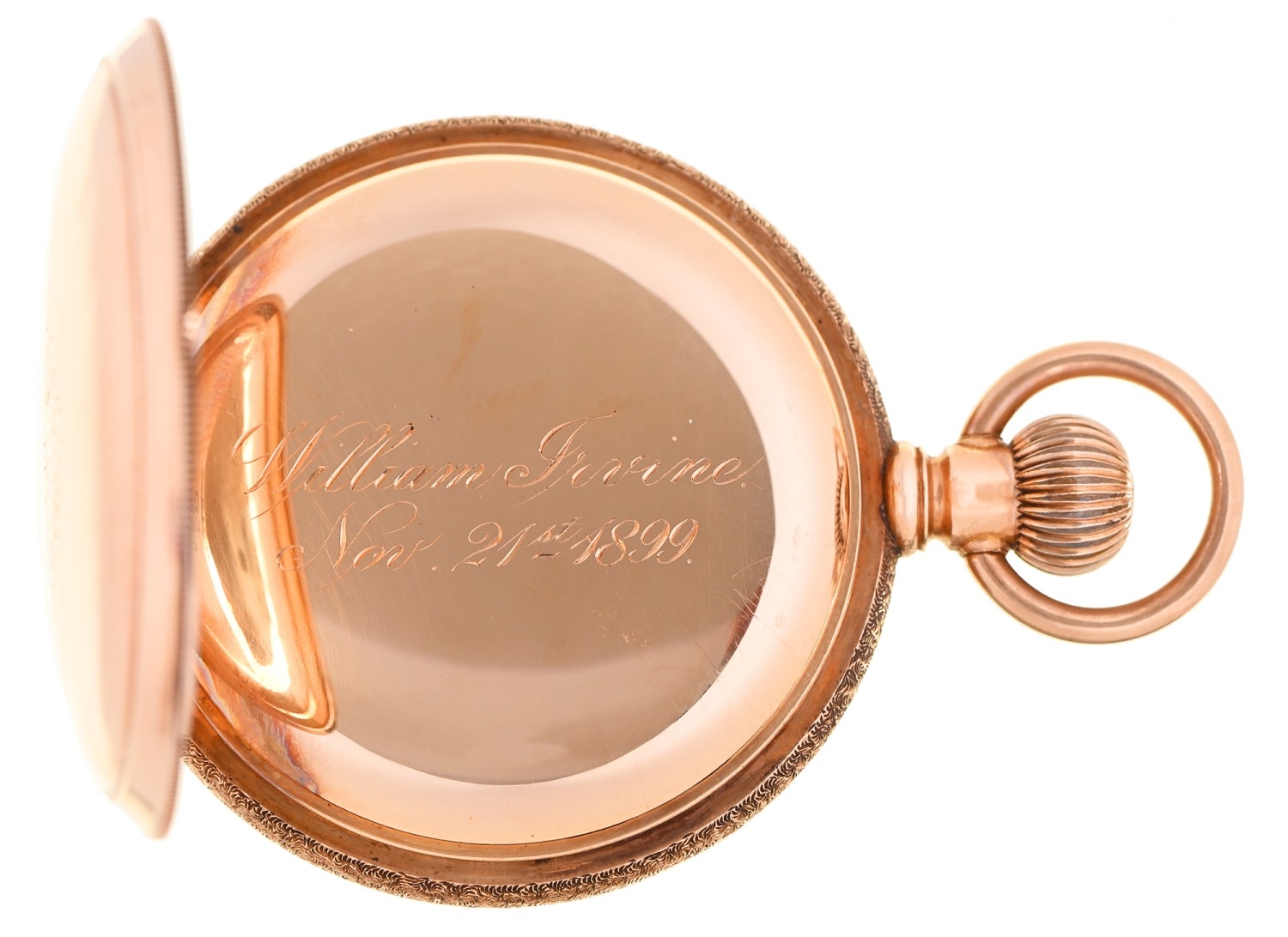 An American Waltham Watch Co gold keyless lever watch, with seventeen jewel bright finished movement No 3814388, gold cuvette engraved William Irvine Novr 21st 1899, the back engine turned and engraved 54mm diam, maker's mark and 14K, 130.4g