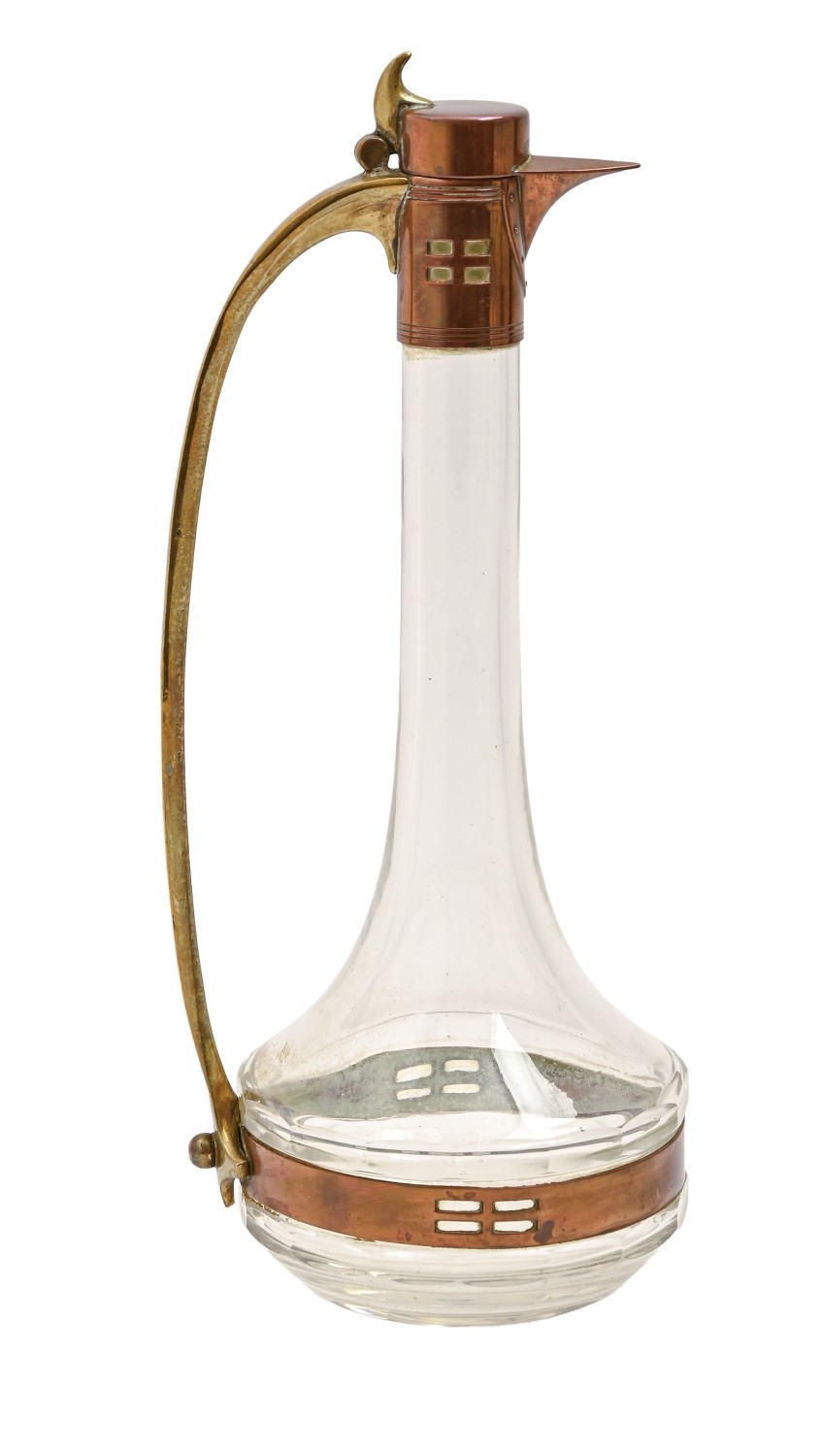 A WMF-style Jugendstil brass, copper-plated, pewter mounted glass wine jug, the design attributed to Jan Eisenoleffel, 26cm h