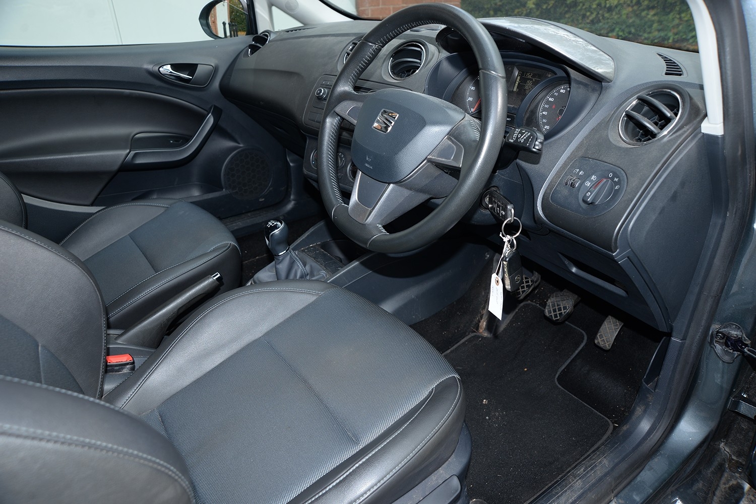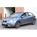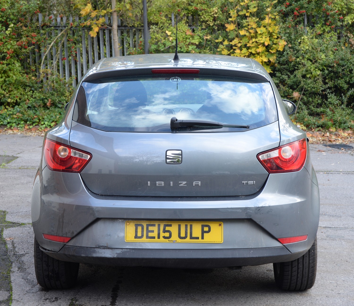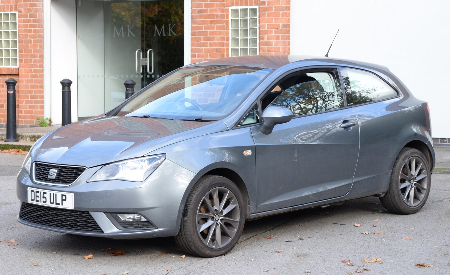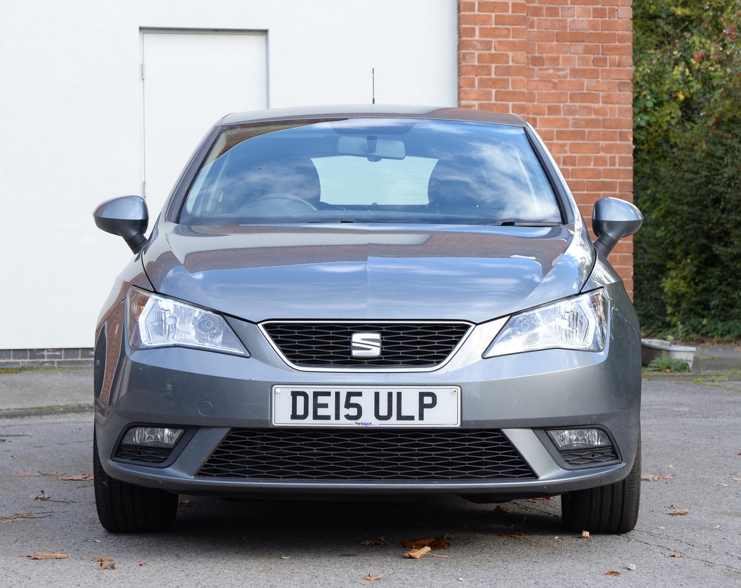 Motor Car. 2015 low mileage Seat Ibiza I-Tech TSI 2-door coupe, 1197 cc, petrol engine, manual transmission, grey, part leather and blue cloth interior seats, two keys, registration number DE15 ULP, 38252 miles, V5 certificate, first registered in April 2015, MOT expired 28 March 2025