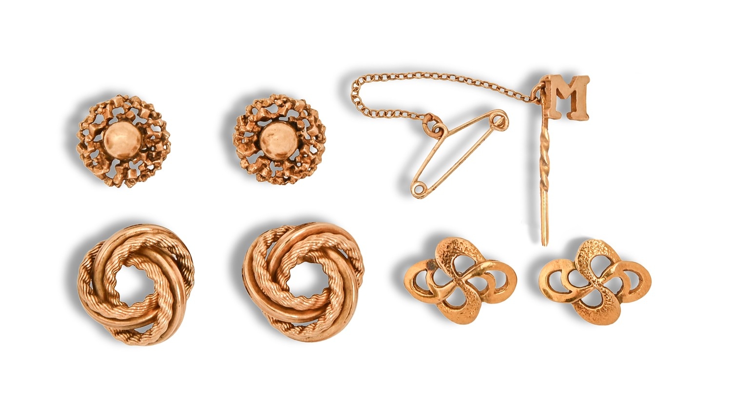 Three pairs of 9ct gold knot and other cufflinks and a gold initial M stickpin, 9.4g