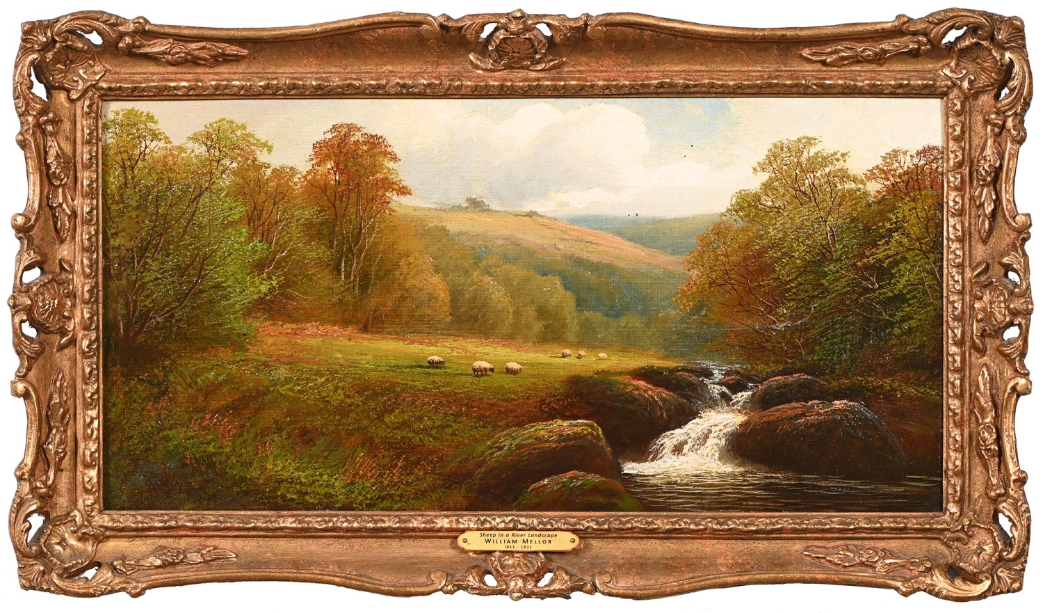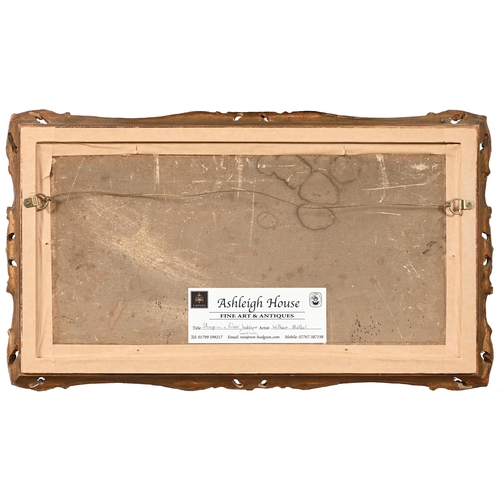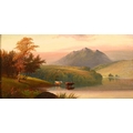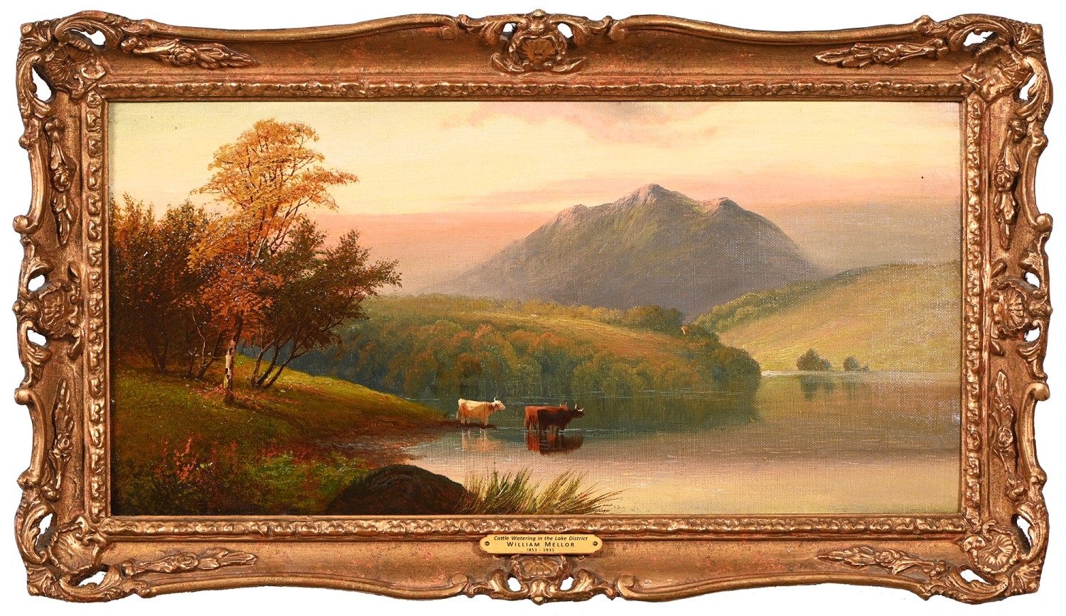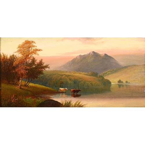 William Mellor (1851-1931) - Landscape with Sheep; Cattle Watering in a Lake, a pair, both signed, oil on board, 21.5 x 44.5cm (2)