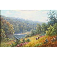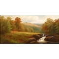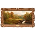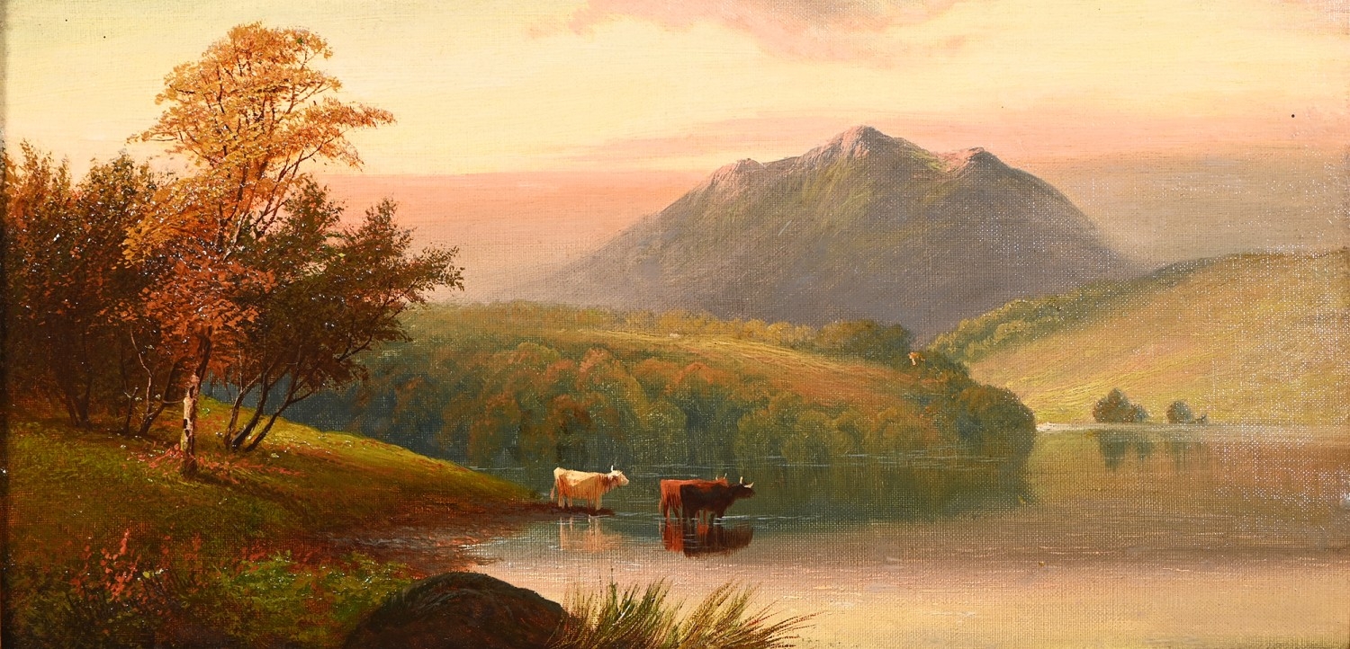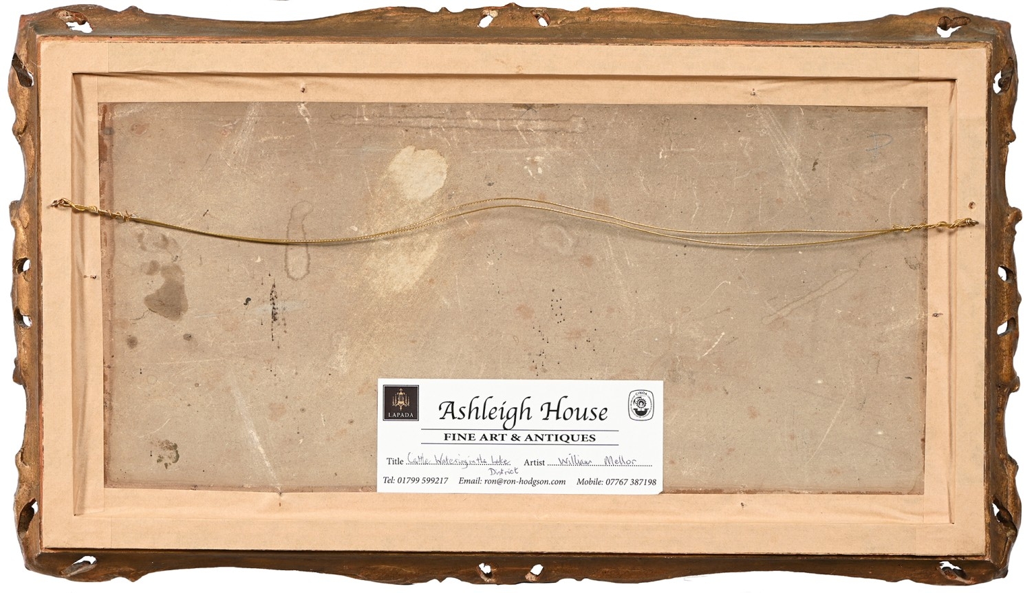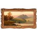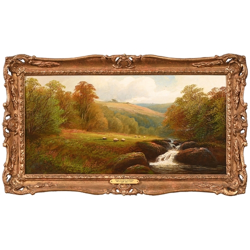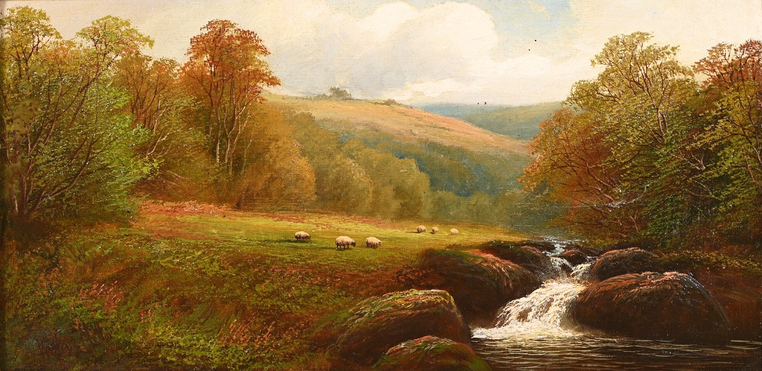 William Mellor (1851-1931) - Landscape with Sheep; Cattle Watering in a Lake, a pair, both signed, oil on board, 21.5 x 44.5cm (2)