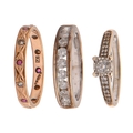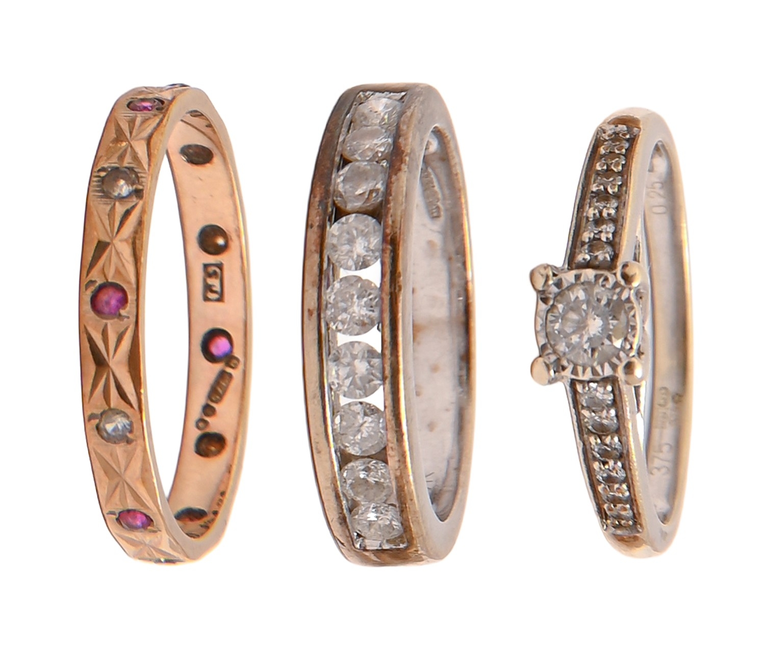 Three diamond and other gem set 9ct gold or 9ct white gold rings, 6.3g, size J, M