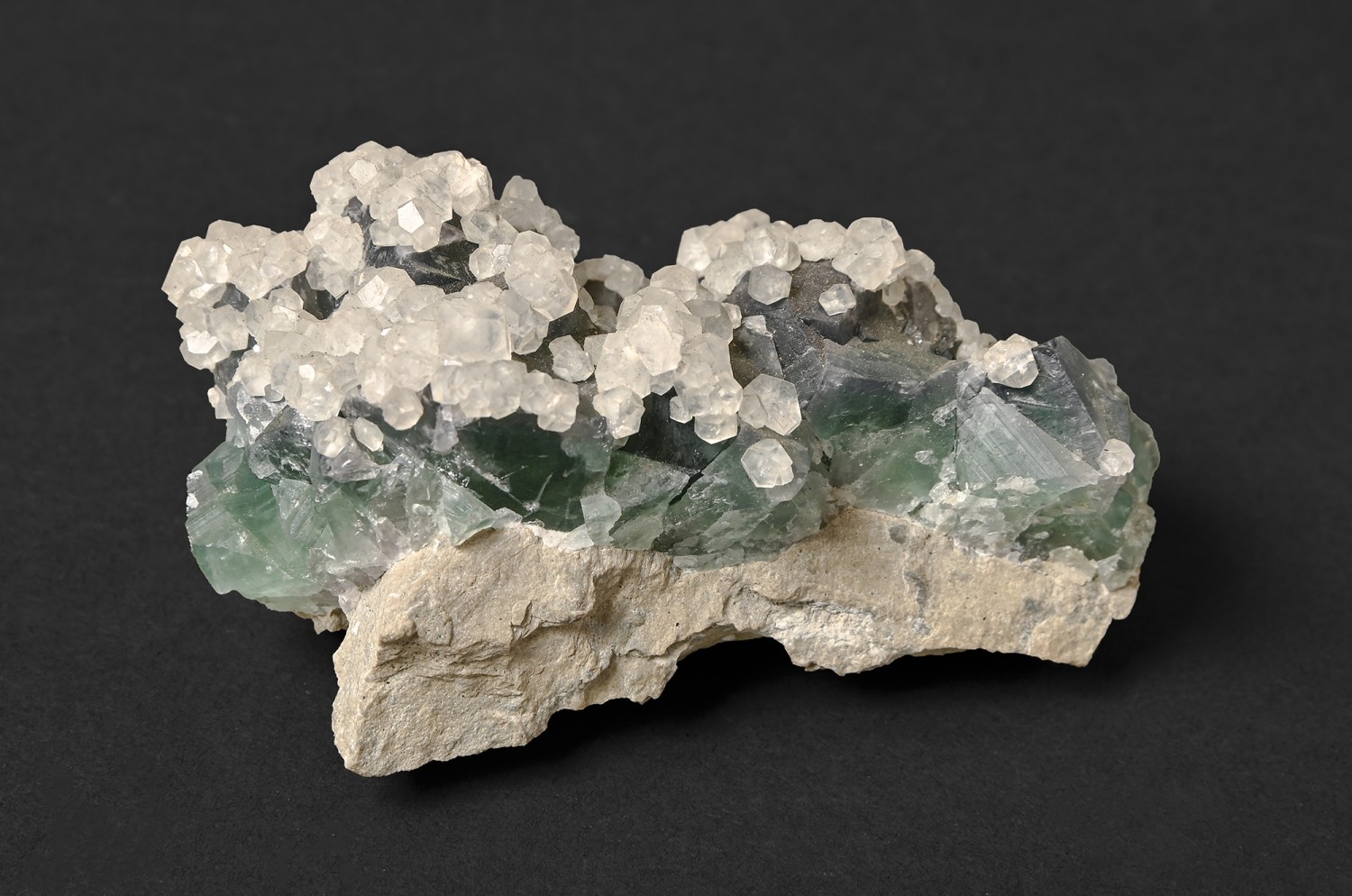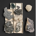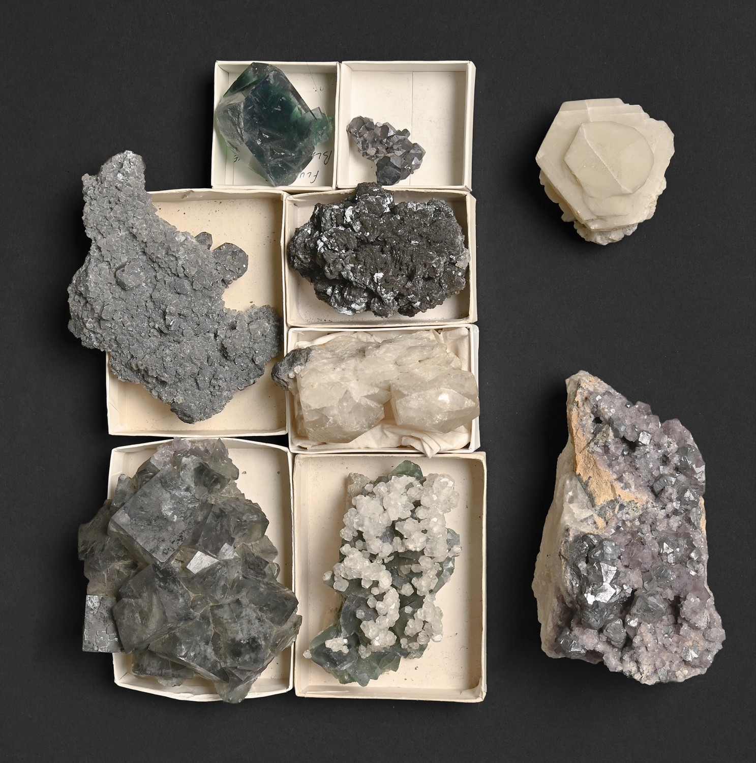 Weardale minerals. Blackdene Mine, nine specimens, including Fluorite, Calcite, Galena and Blende, 130mm and smaller, Harker Collection labels