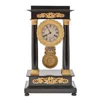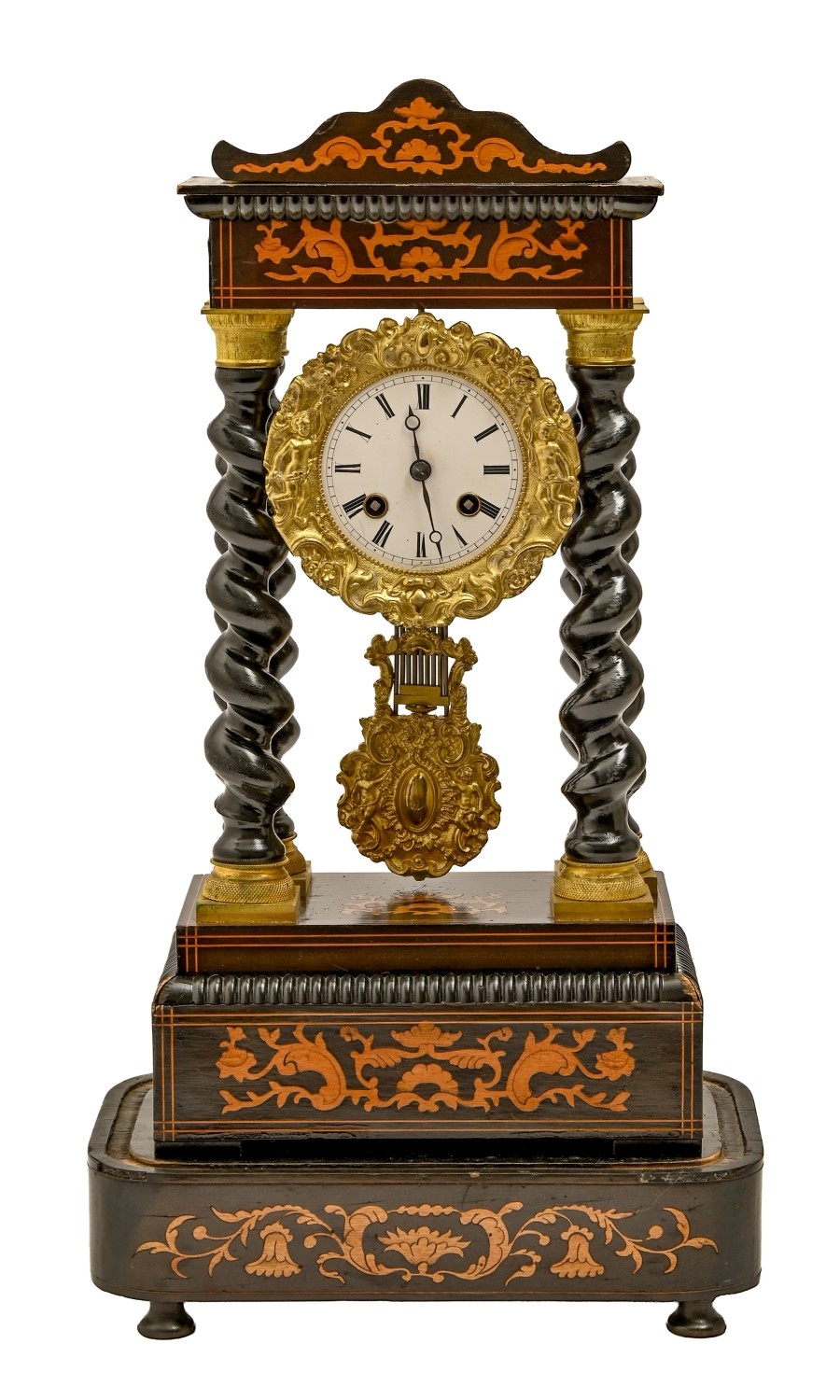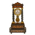 A French gilt brass mounted, inlaid and ebonised portico clock, mid 19th c, with Solomonic columns, enamel dial, bell-striking movement and gridiron pendulum, on conforming plinth, 50cm h, beneath glass dome