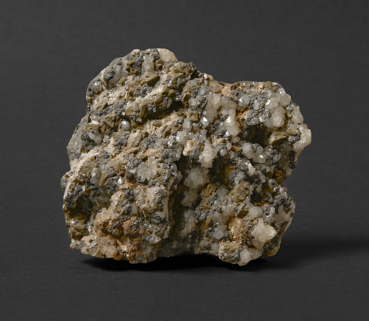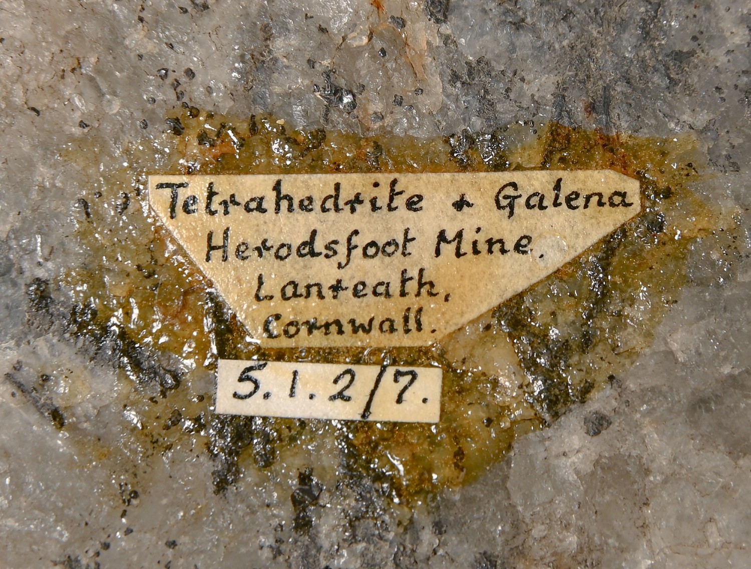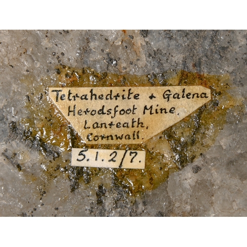 Tetrahedrite coated with Chalcopyrite, Galena and Quartz, Herodsfoot Mine, Lanreath, Cornwall, 151mm, Harker Collection label