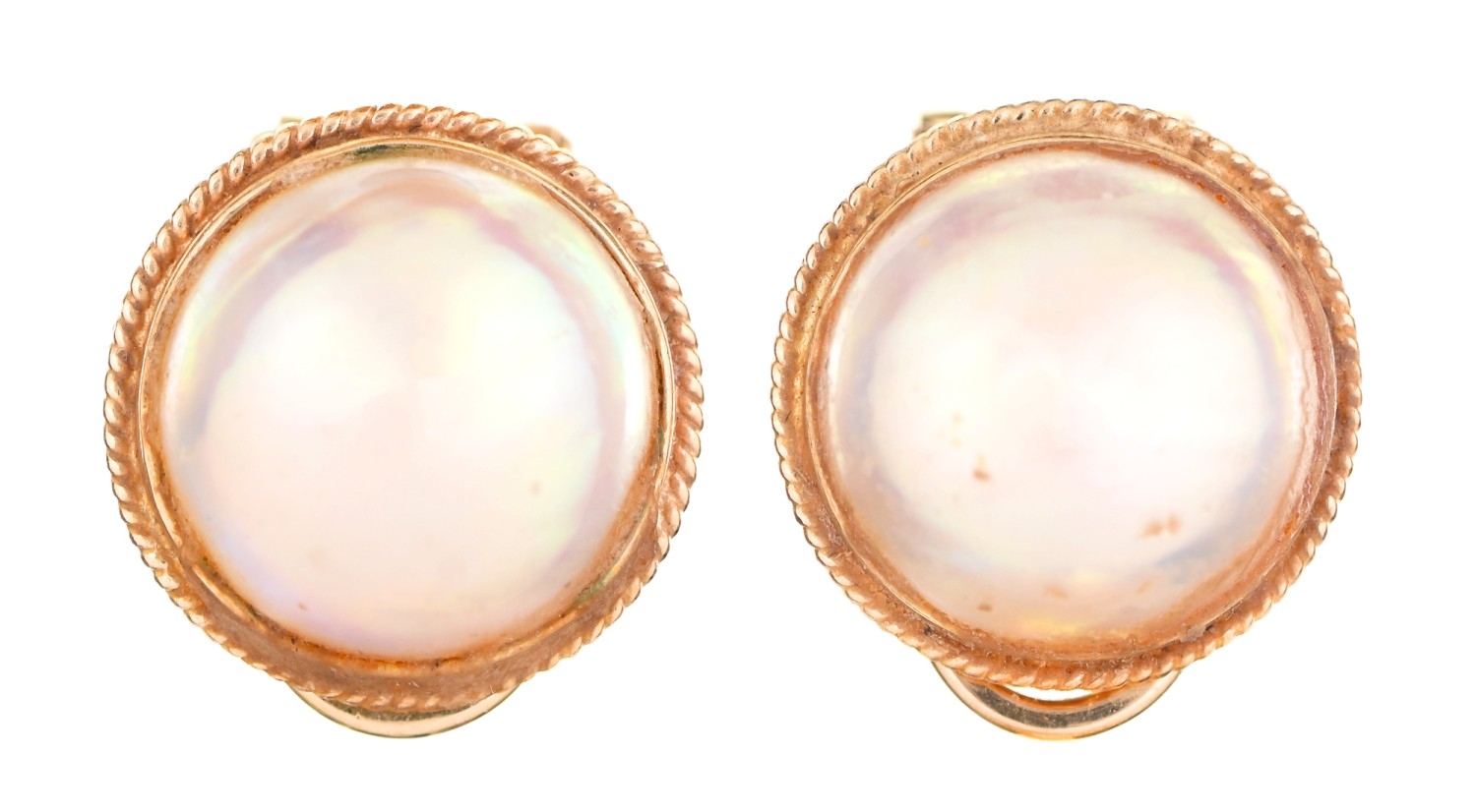 A pair of cultured pearl earrings, in gold, 15mm diam, marked 14K 585, 7g