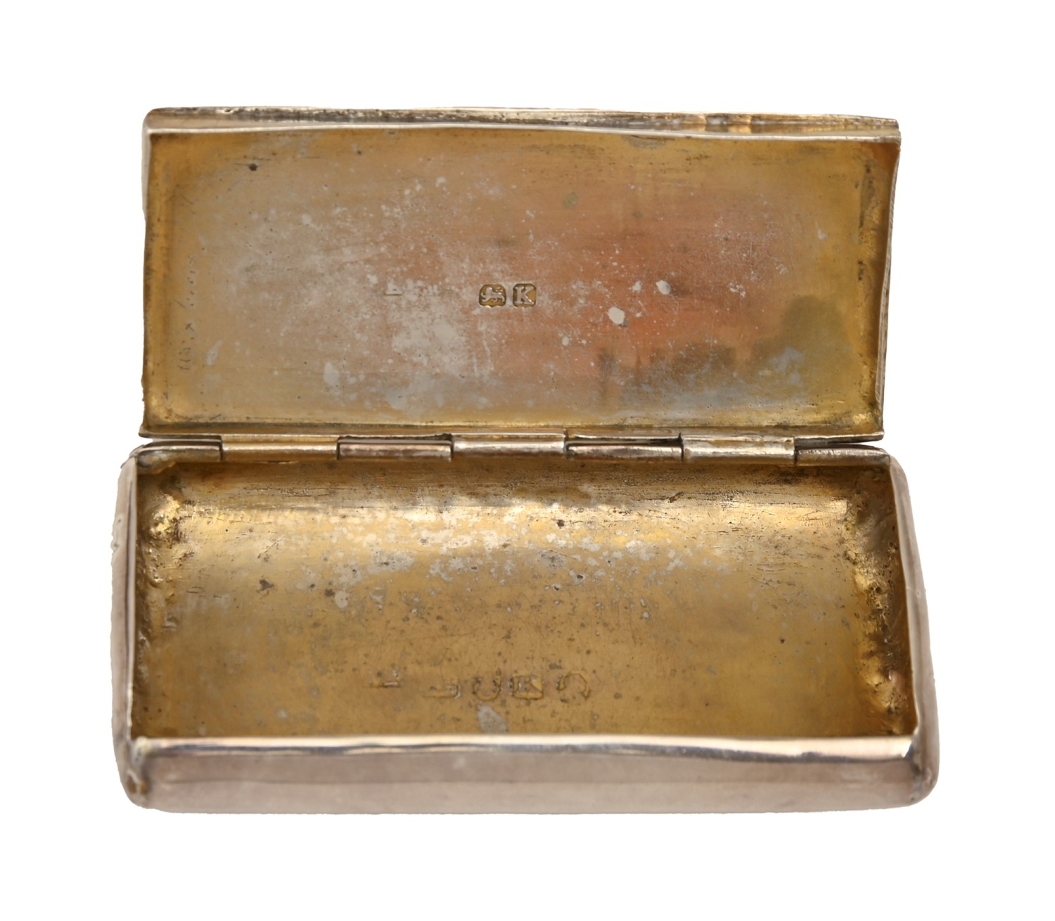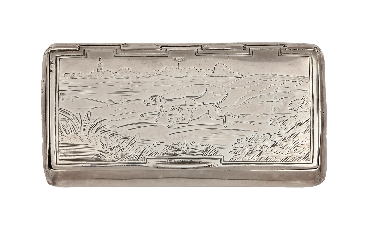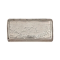 A George III silver snuff box, with flush joint, the lid engraved with a couple of hounds in a landscape, 74mm w, marks rubbed, London 1805, worn, 1oz 6dwt
