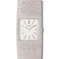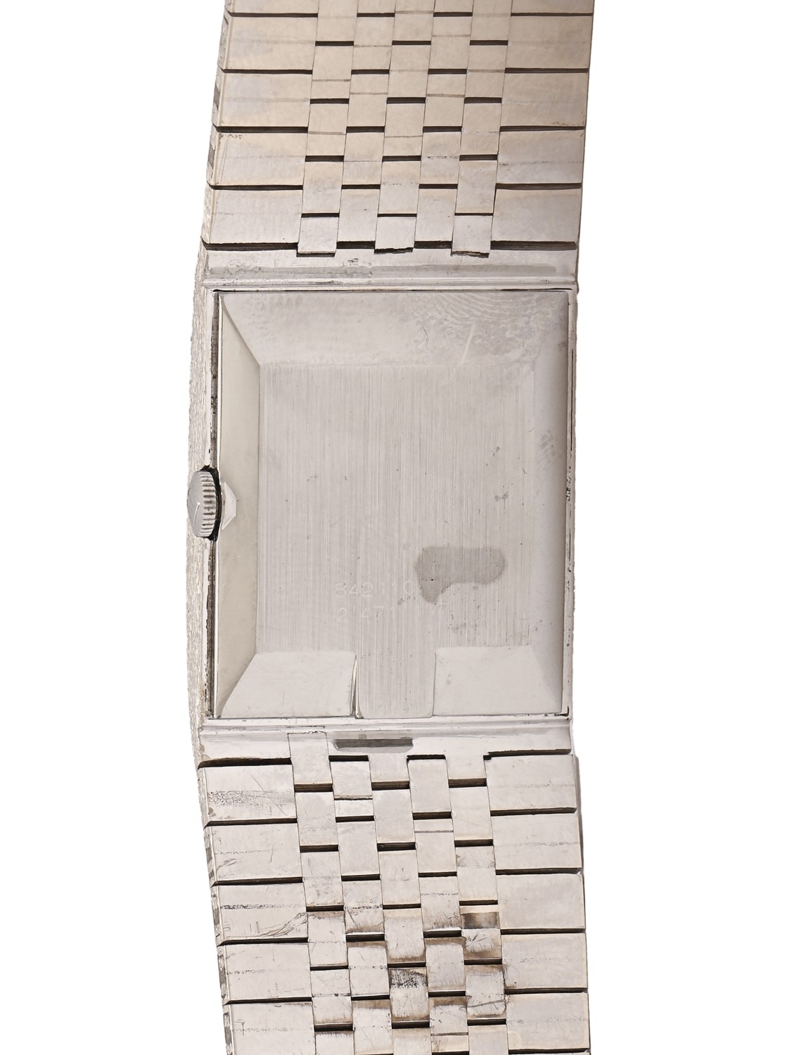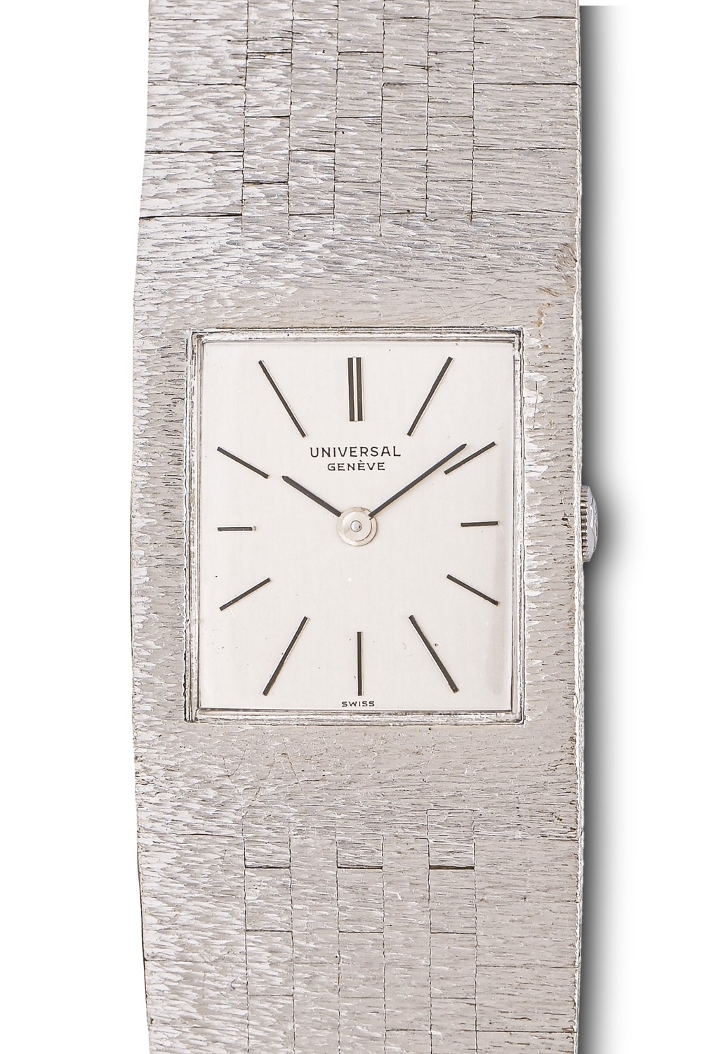 A Universal white gold rectangular wristwatch, mechanical movement, 24 x 33mm, on maker’s integral tapering textured white gold bracelet and clasp with U device, marked on case back 842110/02 471 177, marked 18K, 75.2g