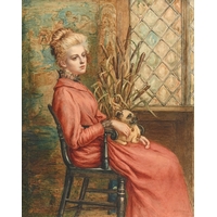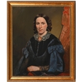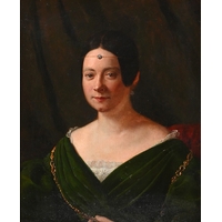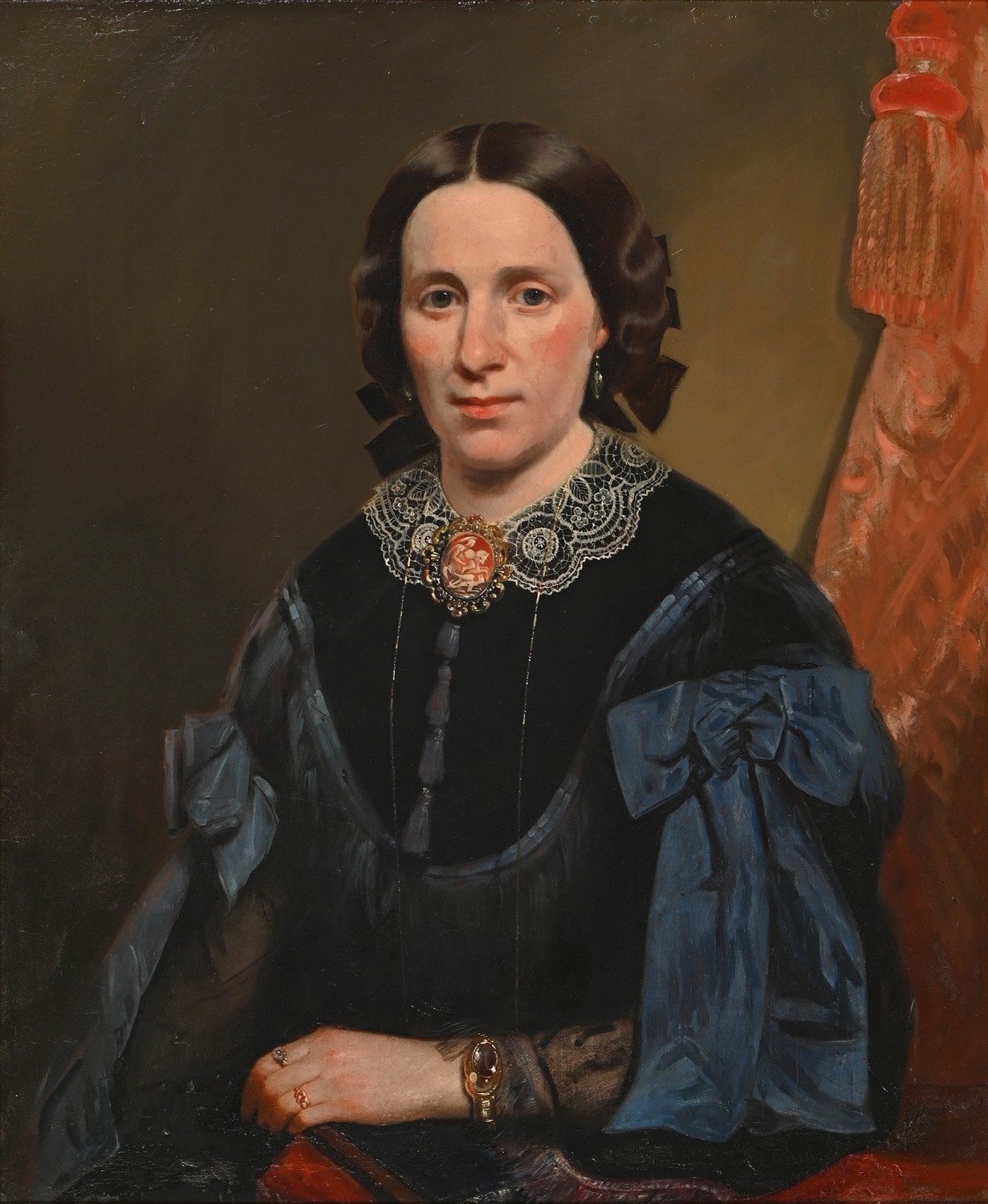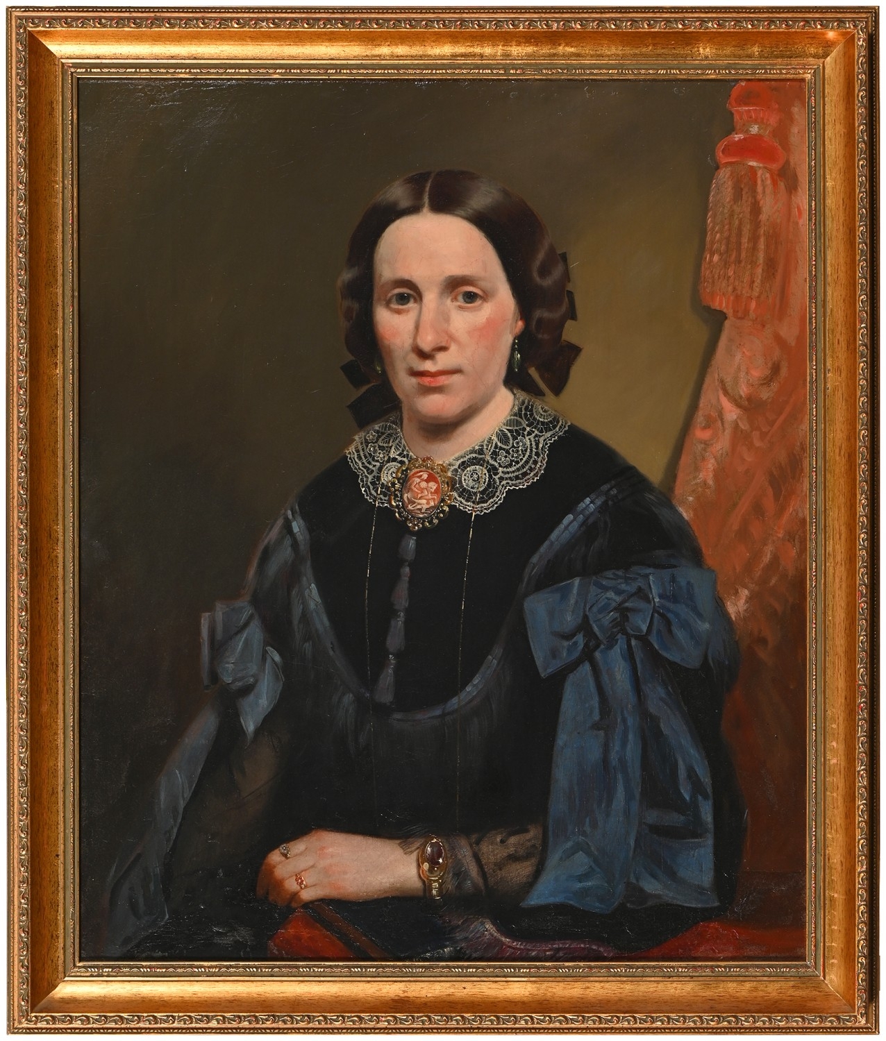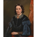 English School, c 1860 - Portrait of a Lady, half-length, seated, wearing lace-trimmed black silk and a cameo brooch of St. George slaying the Dragon, oil on board, 73 x 60cm