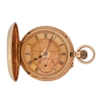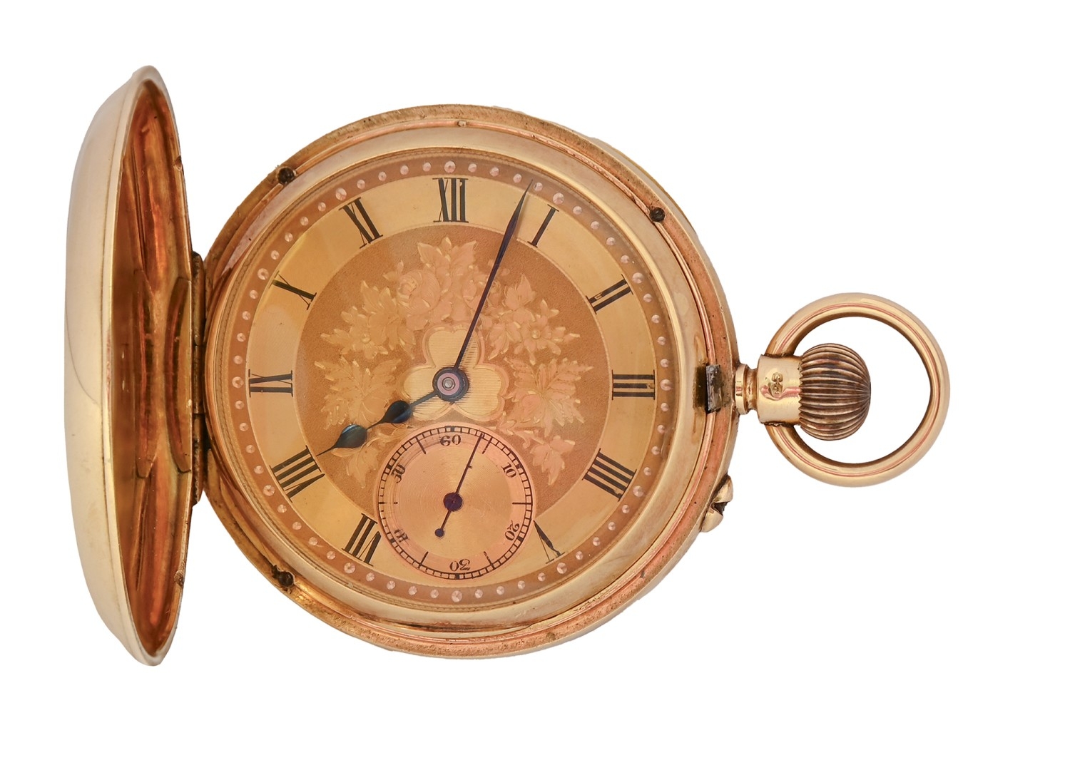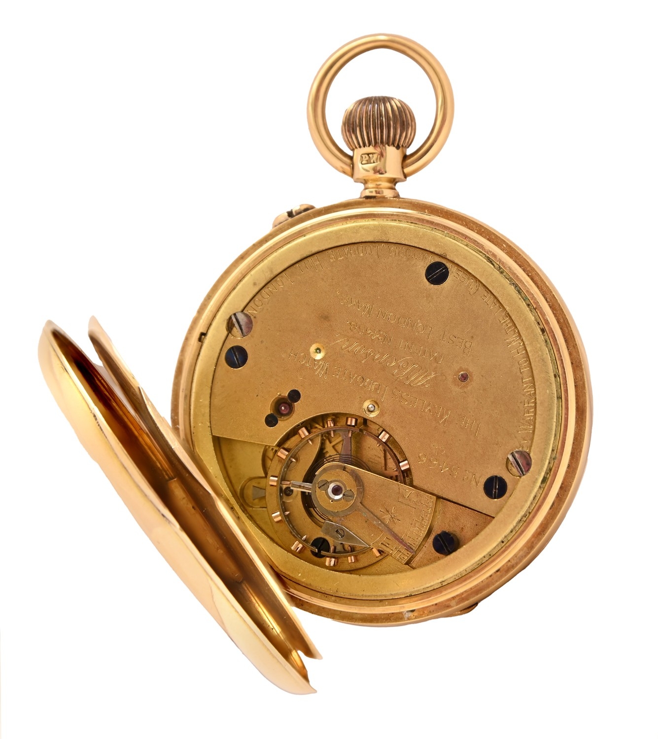 An 18ct gold half hunting cased keyless lever 'Ludgate' watch, J W Benson Ltd, with foliate engraved dial and three quarter plate movement in plain case, gold cuvette and bow, 49mm diam, London 1905, 118.6g