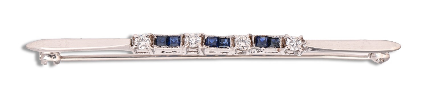 A diamond and calibré cut sapphire bar brooch, in white gold, 5.8cm l, indistinctly marked E & - and control marks, stamped with inventory No 4064, 3.7g