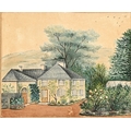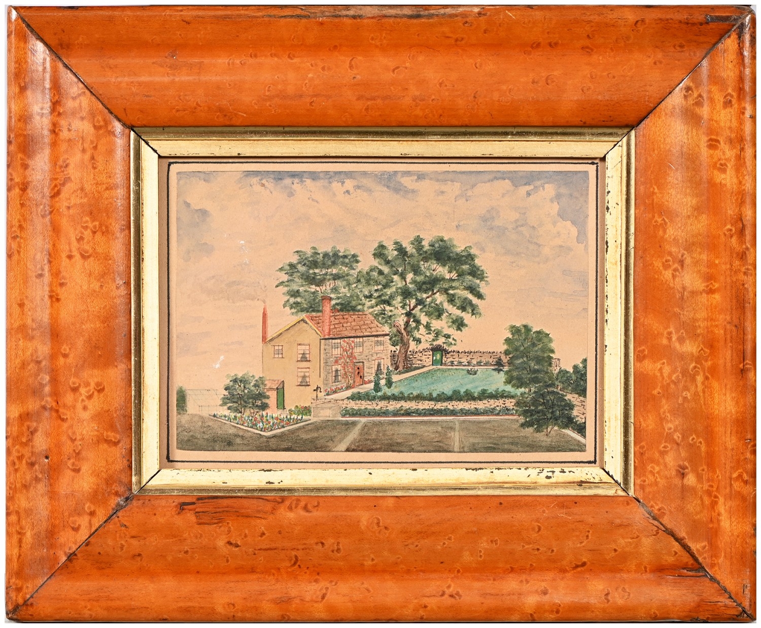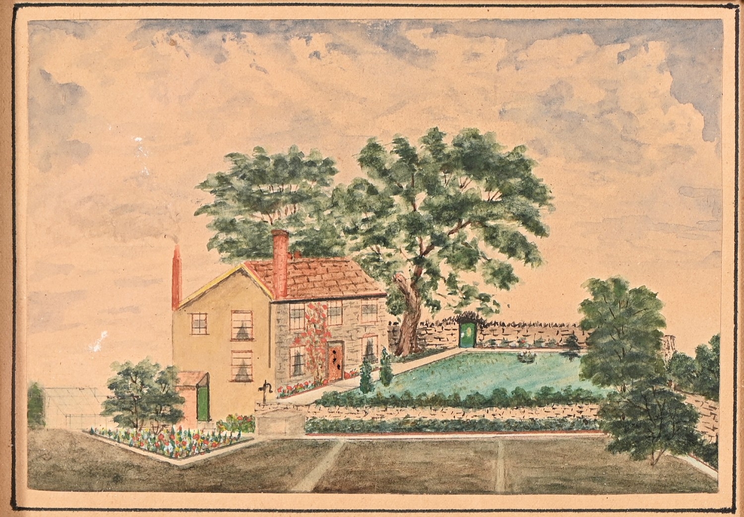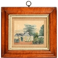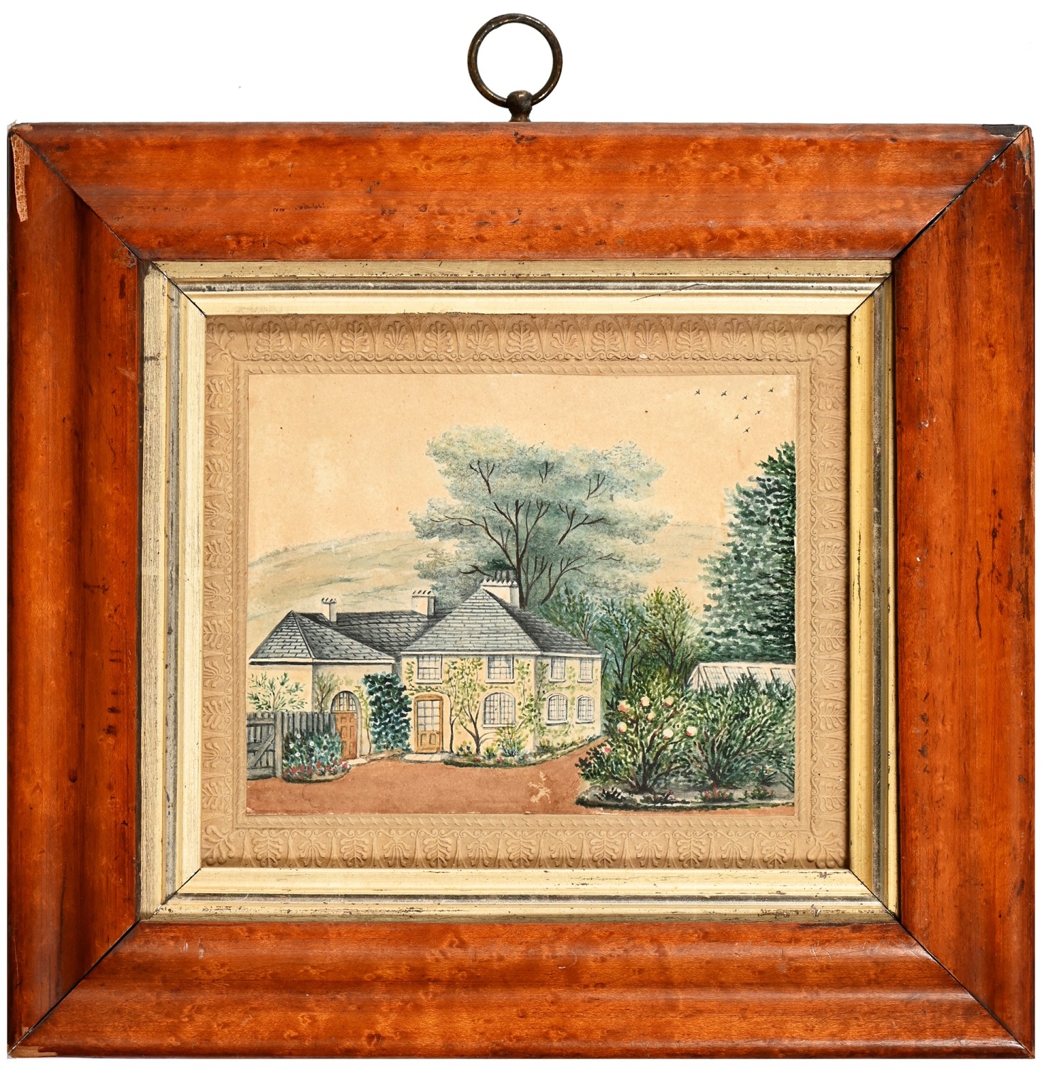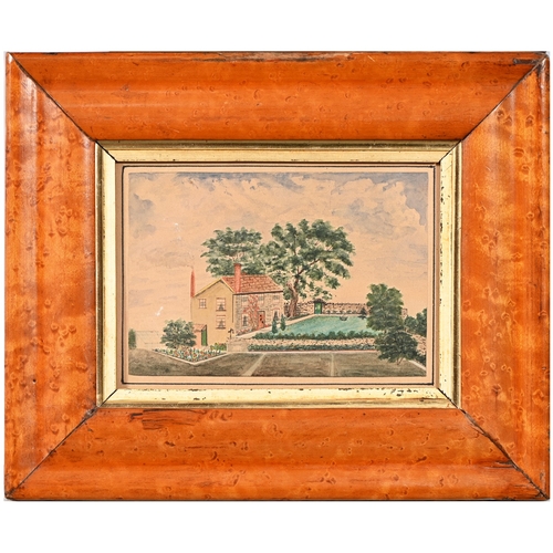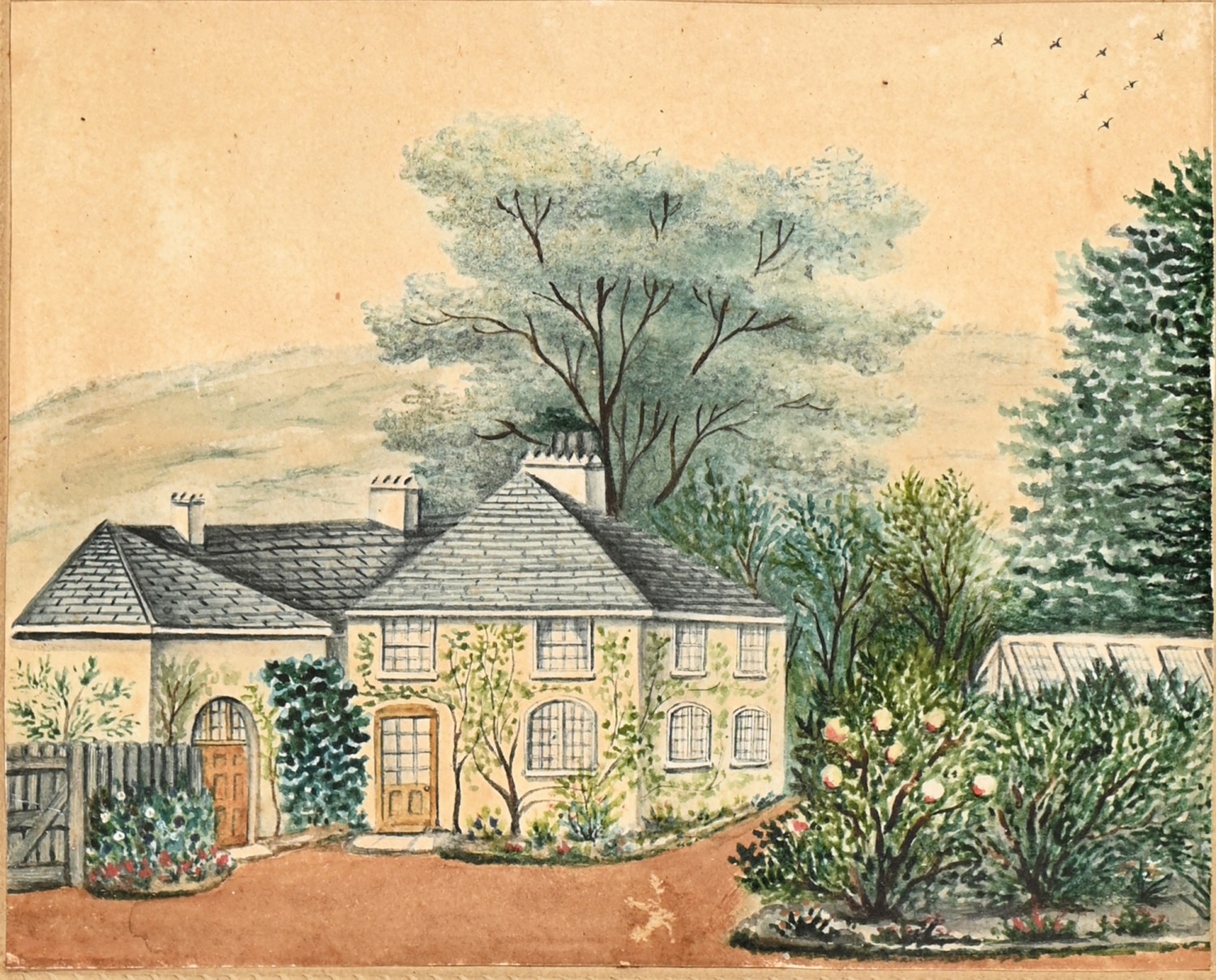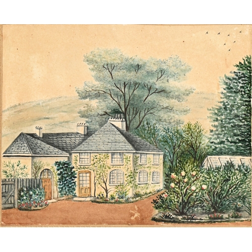 English naïve artist, 19th century - Gardener's Cottage & Glasshouse; Estate Cottage & Garden, two, watercolour, 11 x 13.5cm and 10.5 x 15.5cm, maple frames (2)