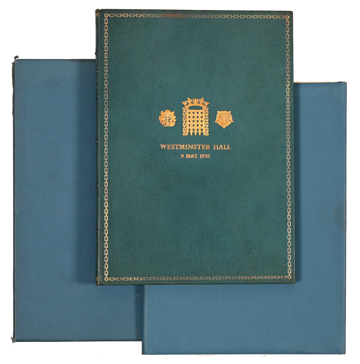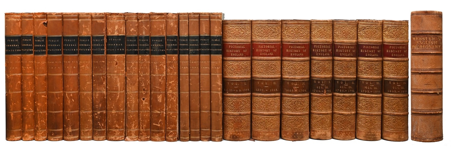A Collection of the Public General Statutes [...] of the Reign of Her Majesty Queen Victoria, Years 31-47, sixteen volume run, London: George Edward Eyre and William Spottiswoode, 1868-83, uniformly bound in contemporary quarter-calf over marbled boards, a few covers off, 4to; [The Reign of George III, 1760-1820], four volume set, from The Pictorial History of England, London: Charles Knight, 1841-44, with three harlequin volumes from the same History, 1838-41, double-column, illustrated, uniform fine bindings of contemporary diced calf gilt, morocco lettering pieces, marbled edges and endpapers, 4to; Fine Binding: An Account of the Ceremony in Westminster Hall on Thursday May 9th 1935 on occasion of the Presentation of Addresses [...] to His Majesty King George V Congratulating Him on the Celebration of the Silver Jubilee [...], loosely-inserted TLS from the commissioner to the recipient, Cambridge: [Privately] Printed by Walter Lewis, at the University Press, 1935, plates, full turquoise morocco by the W.H. Smith bindery, signed, all edges gilt, fleece-lined wrap, slip case en suite, 4to; etc., (25)