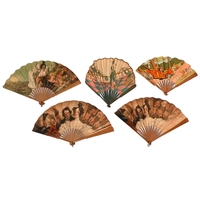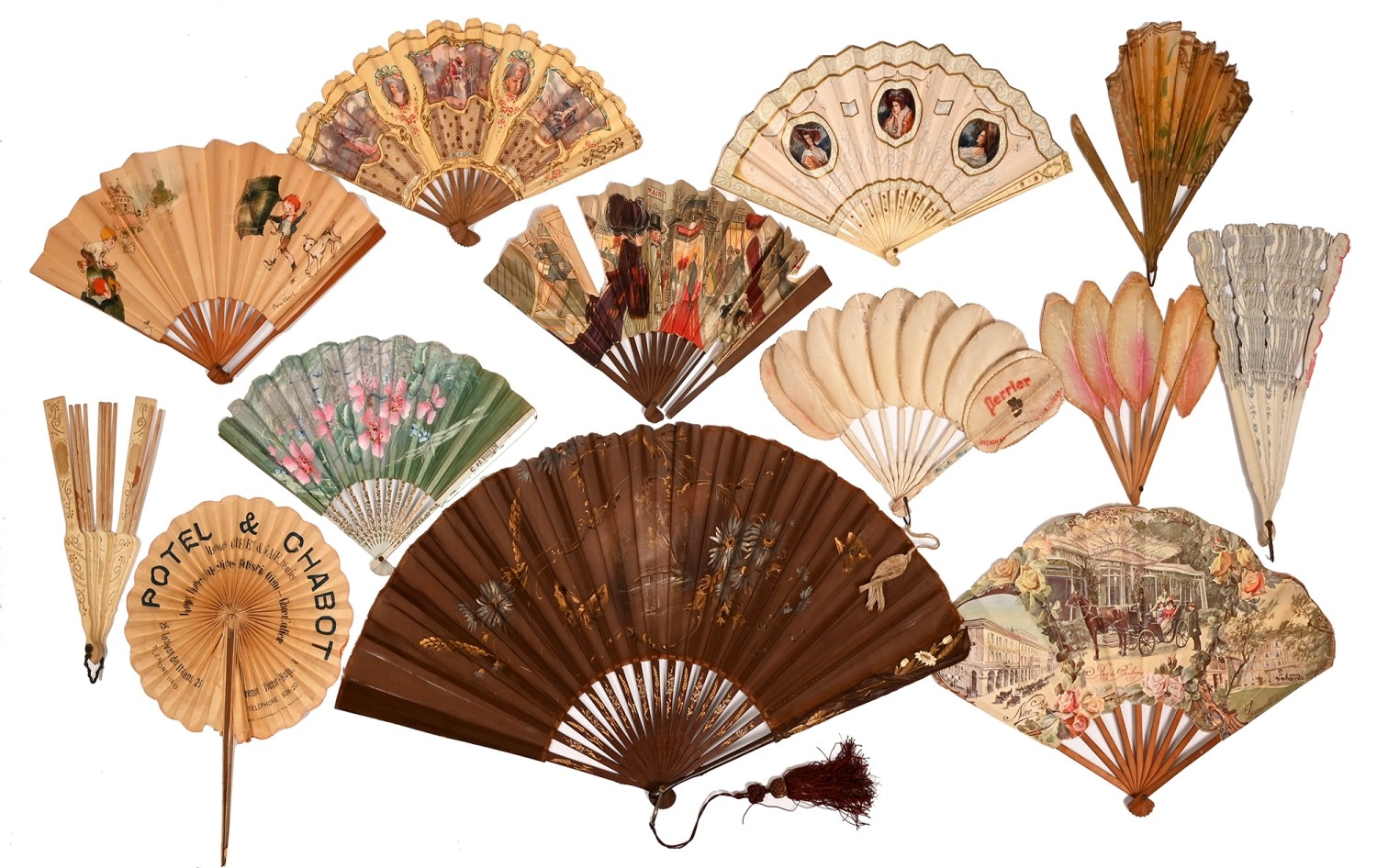 Thirteen fin de siecle paper fans, to include a French advertising fan for Perrier and another for Armenonville Café de Paris designed by Georges Redon, 35cm l and smaller