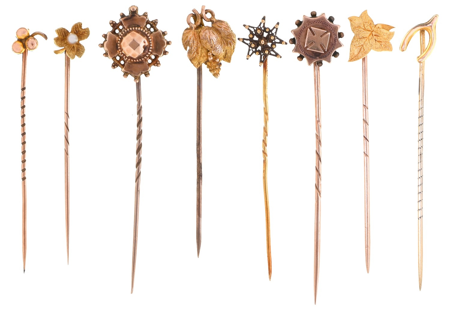 Eight Victorian gold stickpins, with ivy leaf, grapes, wishbone or other terminal, the pins of gold or base metal, various sizes, 9g