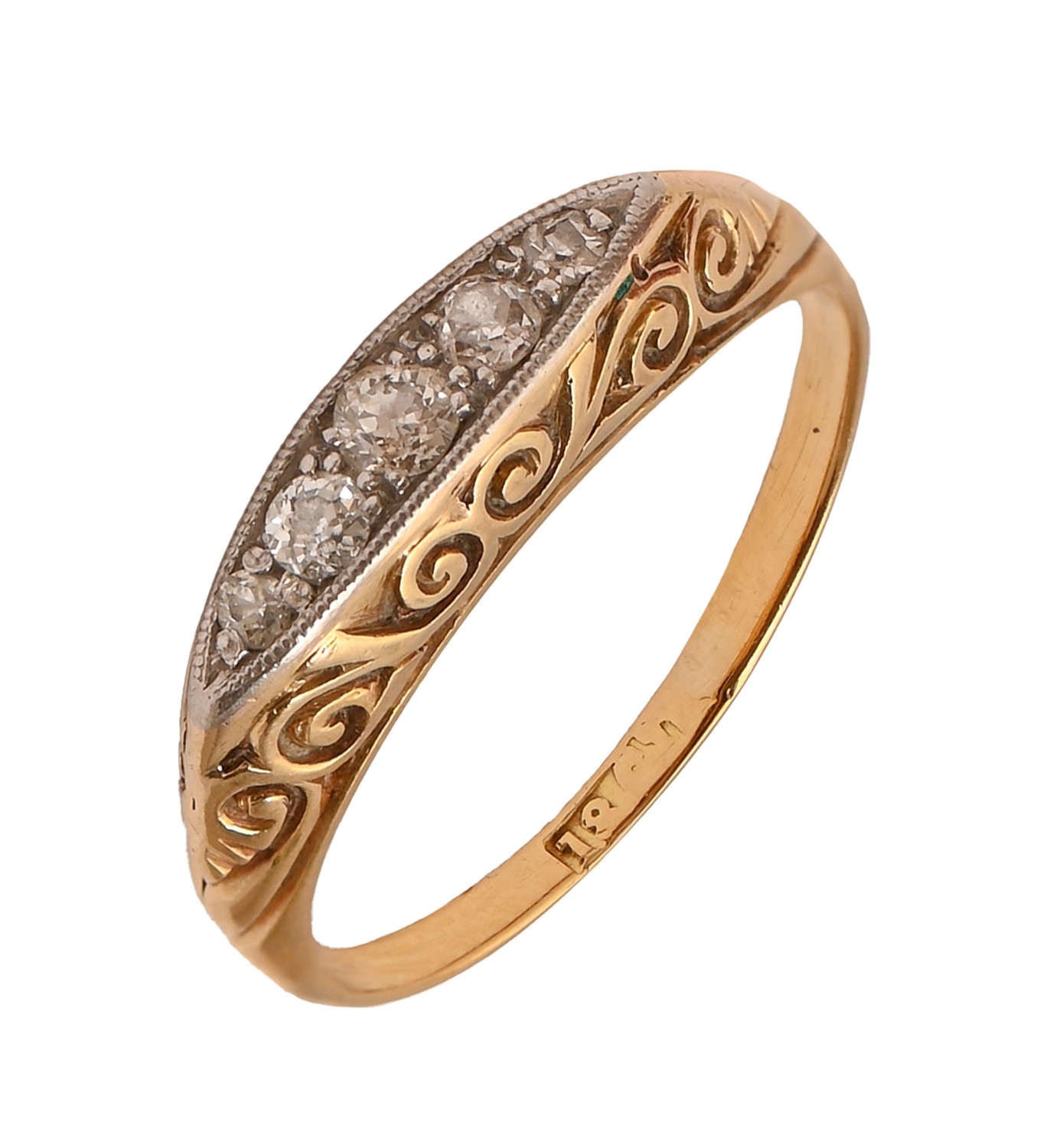 A diamond ring, c1900, the old cut diamonds millegrain set, in gold, marked 18ct, 2.3g, size I