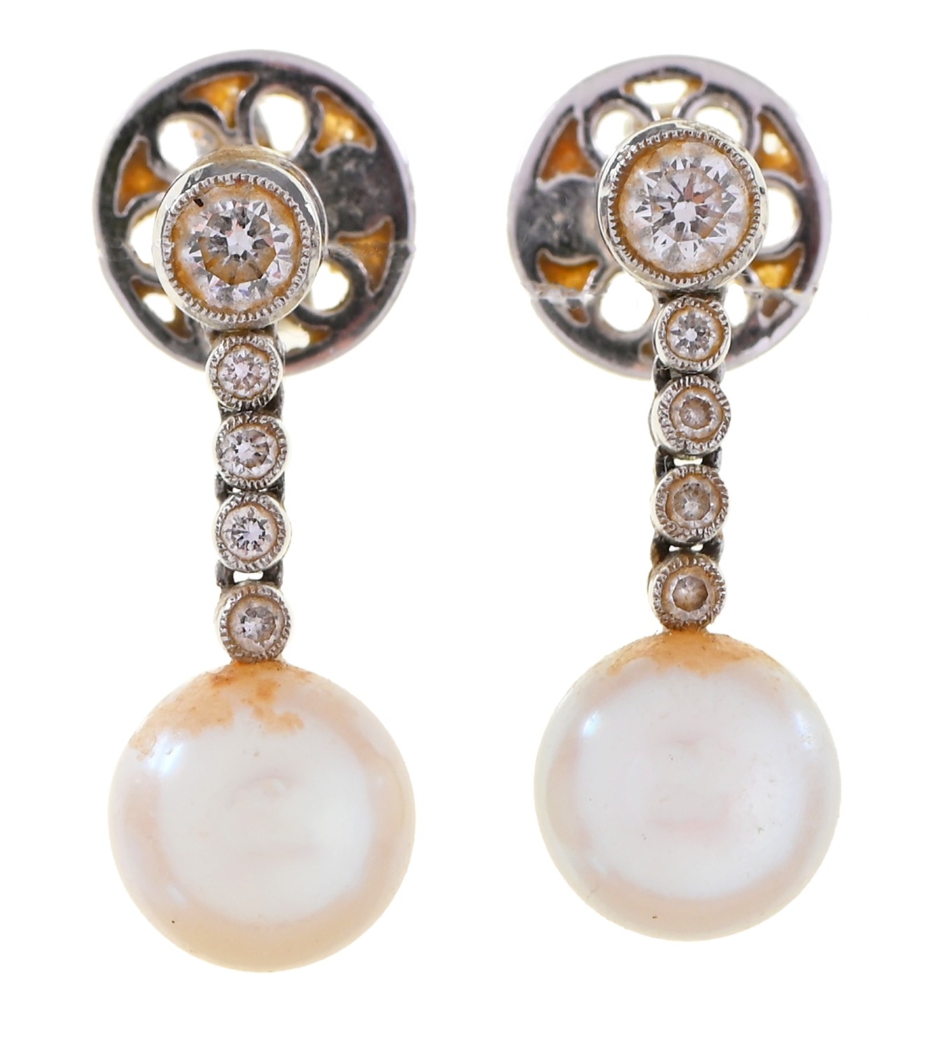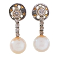 A pair of diamond and cultured pearl earrings, in 18ct white gold and fully articulated, 20mm h, maker L S J, London, date letter obscured, early 21st, 4.4g