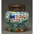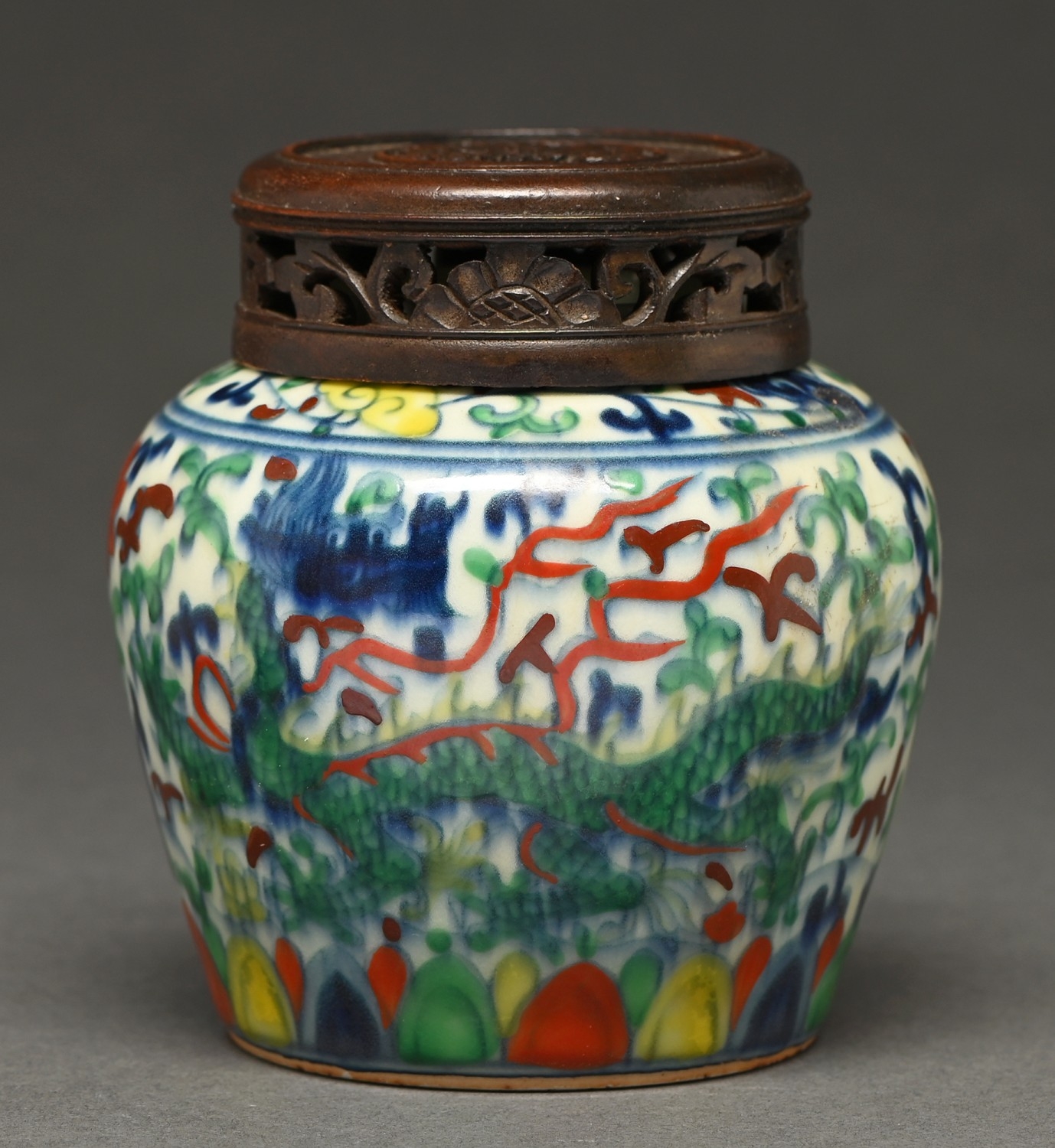 A Chinese wucai dragon jar, painted in the typical palette under- and over-glaze, pierced and carved hardwood cover, 11.5cm h, underglaze blue character mark