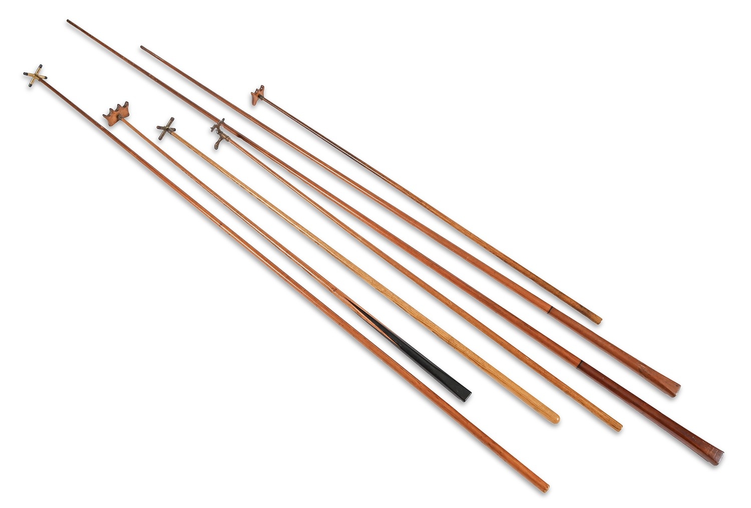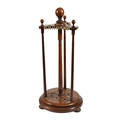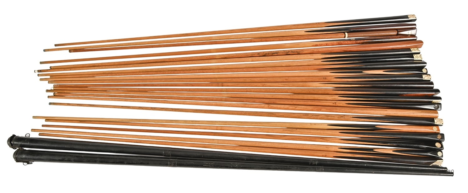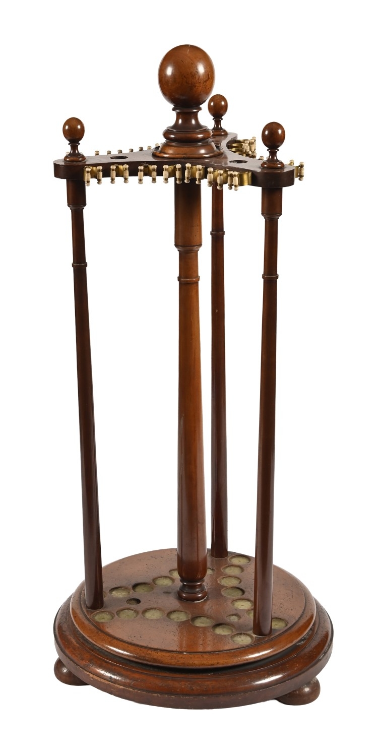 Billiards and Snooker. An Edwardian mahogany revolving cue stand, with globe finials, on turned base with bun feet, 116cm h and twenty eight contemporary and vintage cues and rests